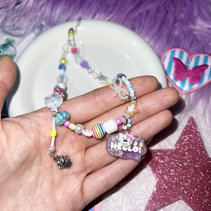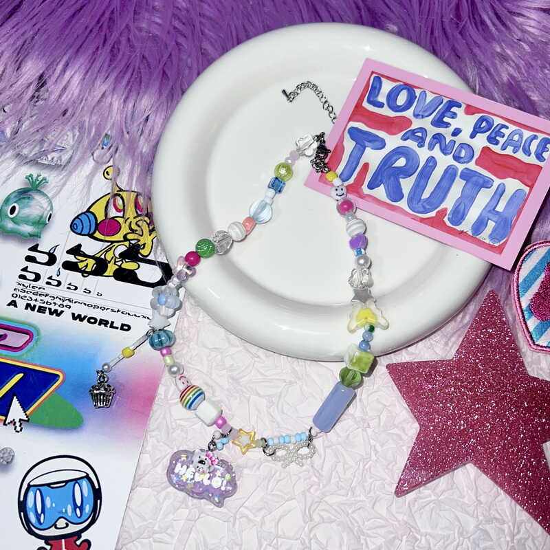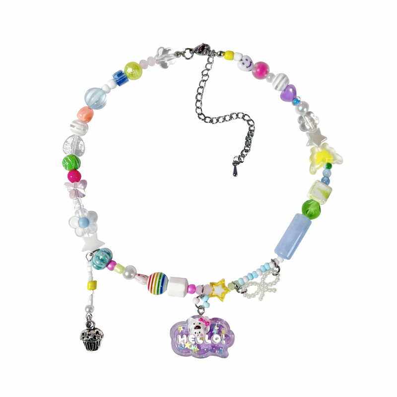 夏日岛屿 多巴胺手工串珠KT猫猫吊牌项链ins糖果色甜酷锁骨链颈链