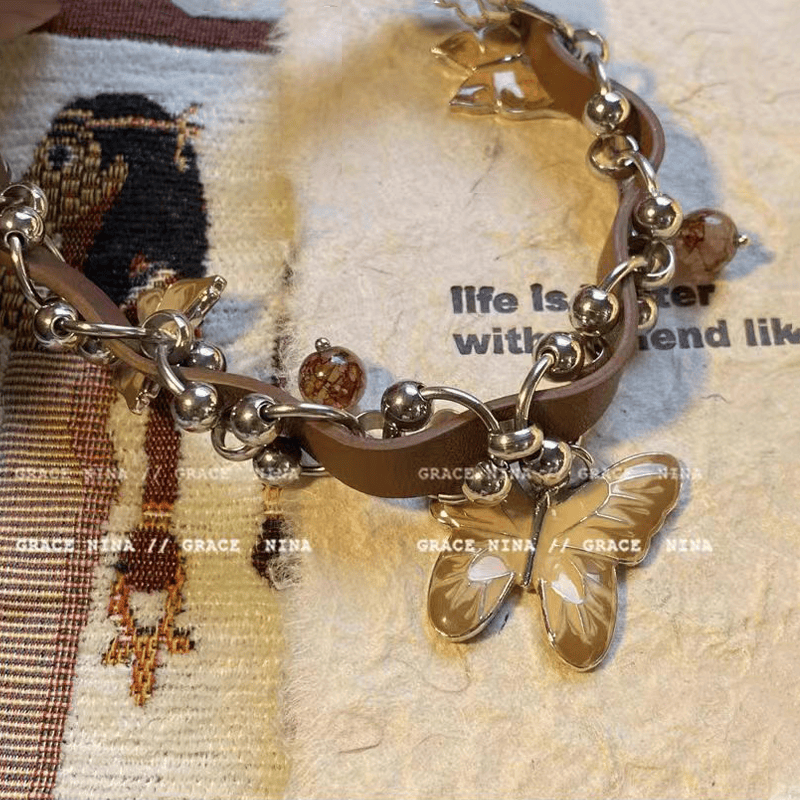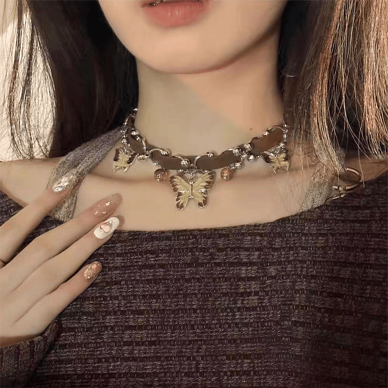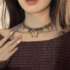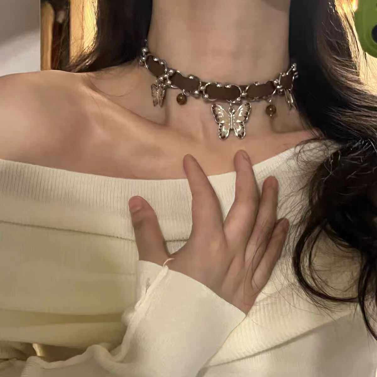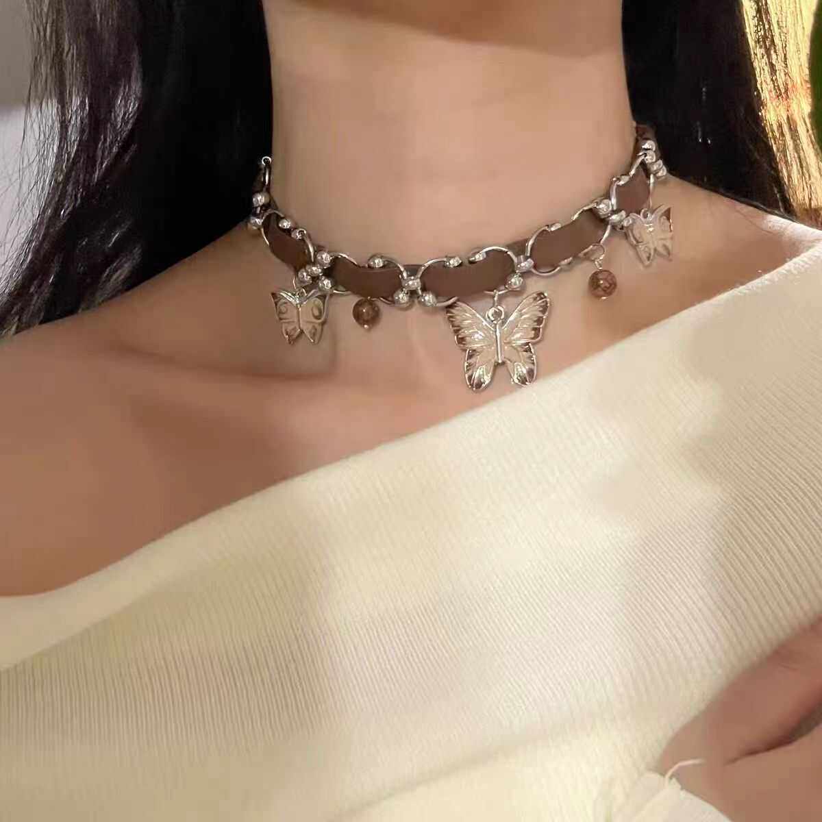 美拉德重工蝴蝶项圈女高级感复古棕色皮革项链轻奢辣妹choker颈链