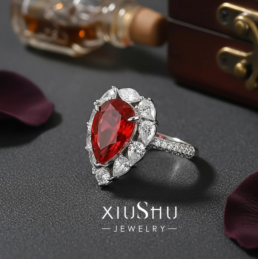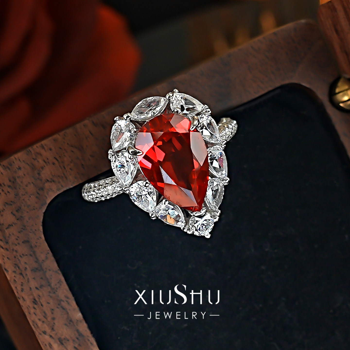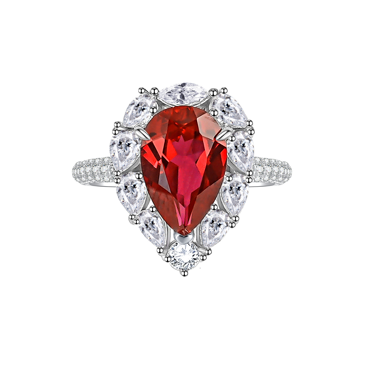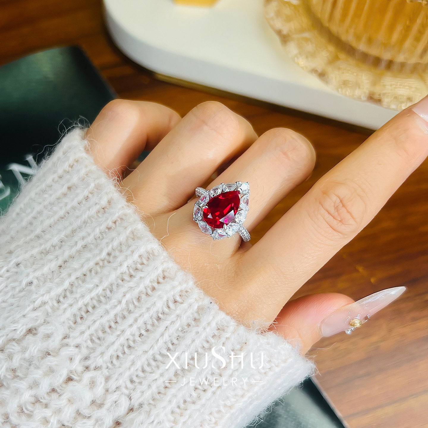 4.5ct满火彩培育鸽血红宝石925纯银水滴戒指晚宴新年礼物水滴富婆