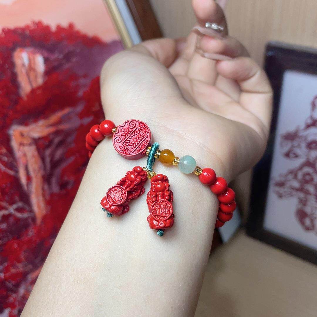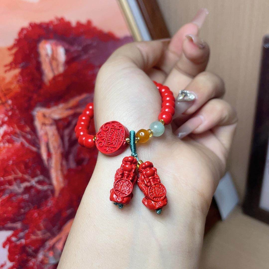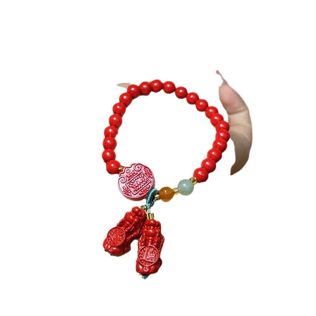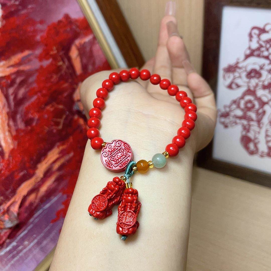 2026朱砂红砂双貔貅手串简约百搭小众设计显白红色圆珠手链女款