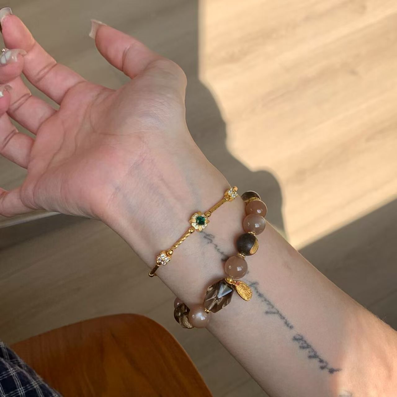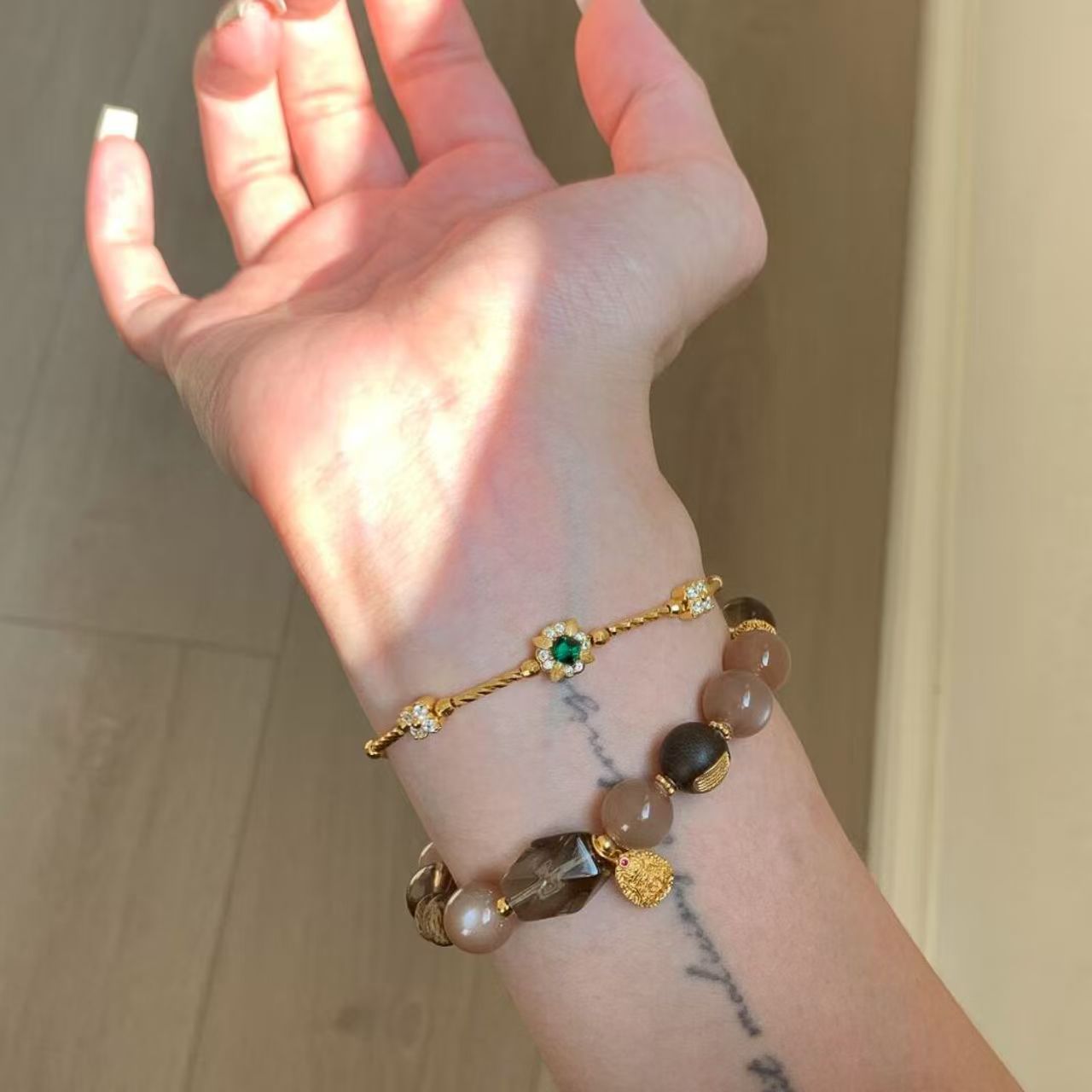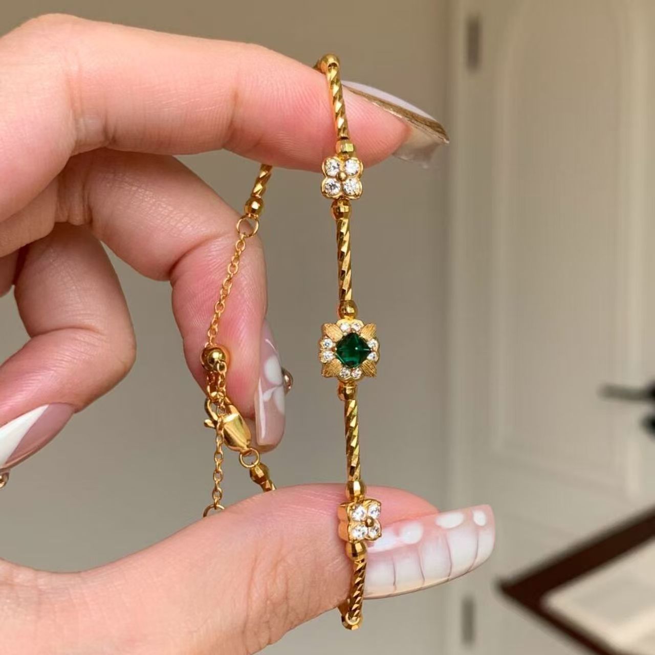 中古祖母绿色镶钻花朵手链ins风小众清冷感气质叠戴百搭手饰女