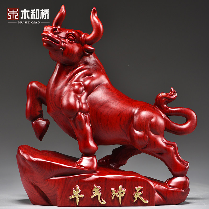 红色木质雕刻牛十二生肖木牛气冲天摆件家居客厅办公装饰开业送礼