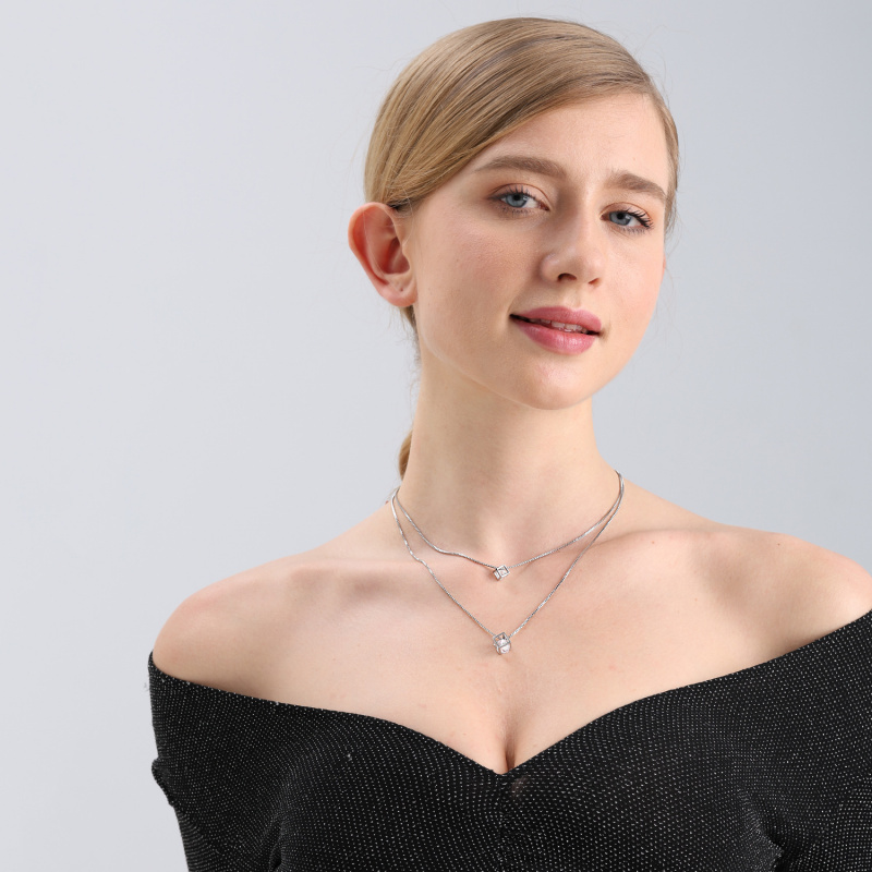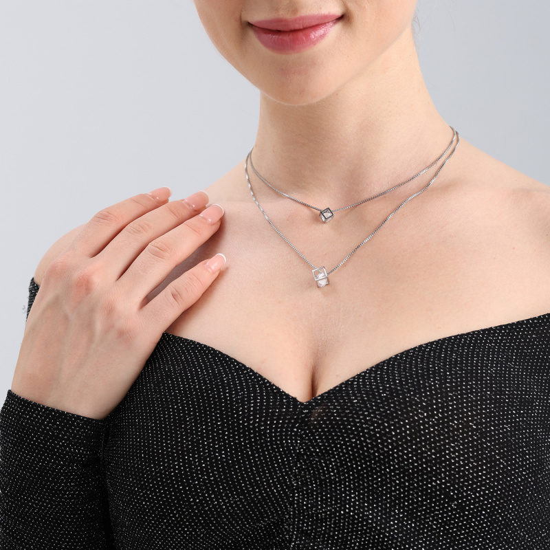 欧美饰品 爱情几何魔方锆石吊坠潮女项链 双层金属盒子链项饰首饰