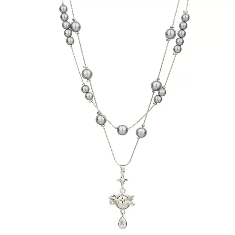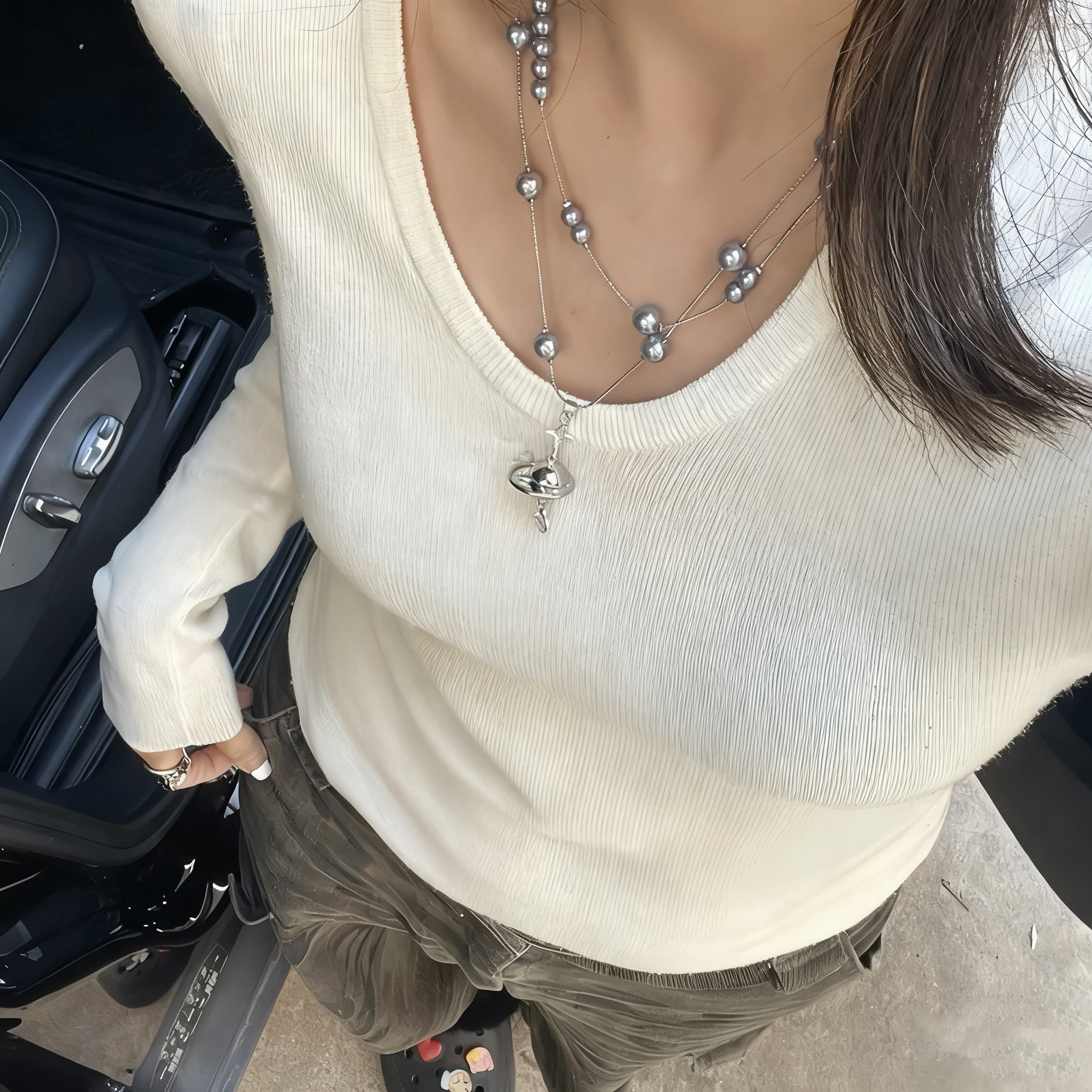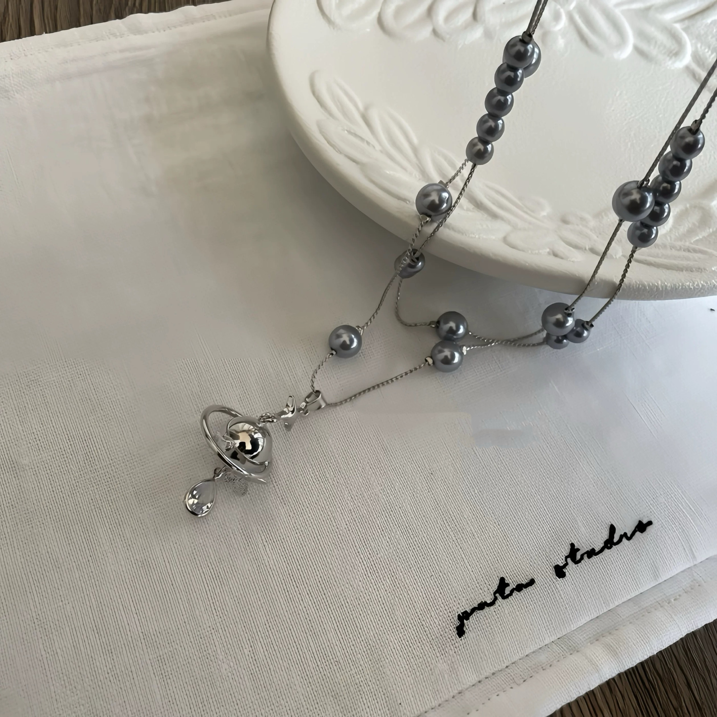 飞船灰色珍珠吊坠项链女小众独特个性毛衣链高级感叠戴长款卫衣链