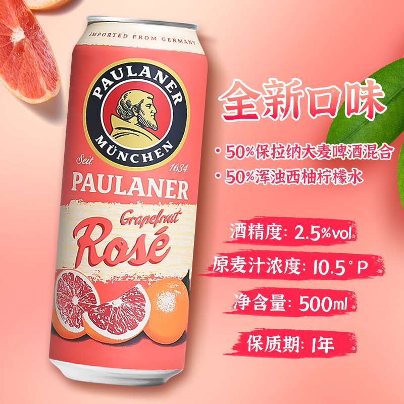 整箱德国进口保拉纳/柏龙西柚玫瑰500ml*24听 果味精酿啤酒