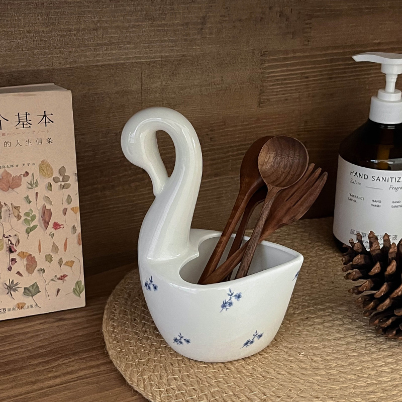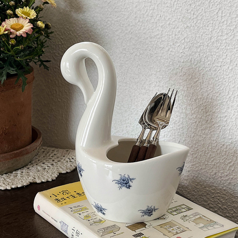 枝悟 碎花陶瓷天鹅杯 法式玫瑰花瓶摆件 厨房勺叉收纳罐 文艺礼物