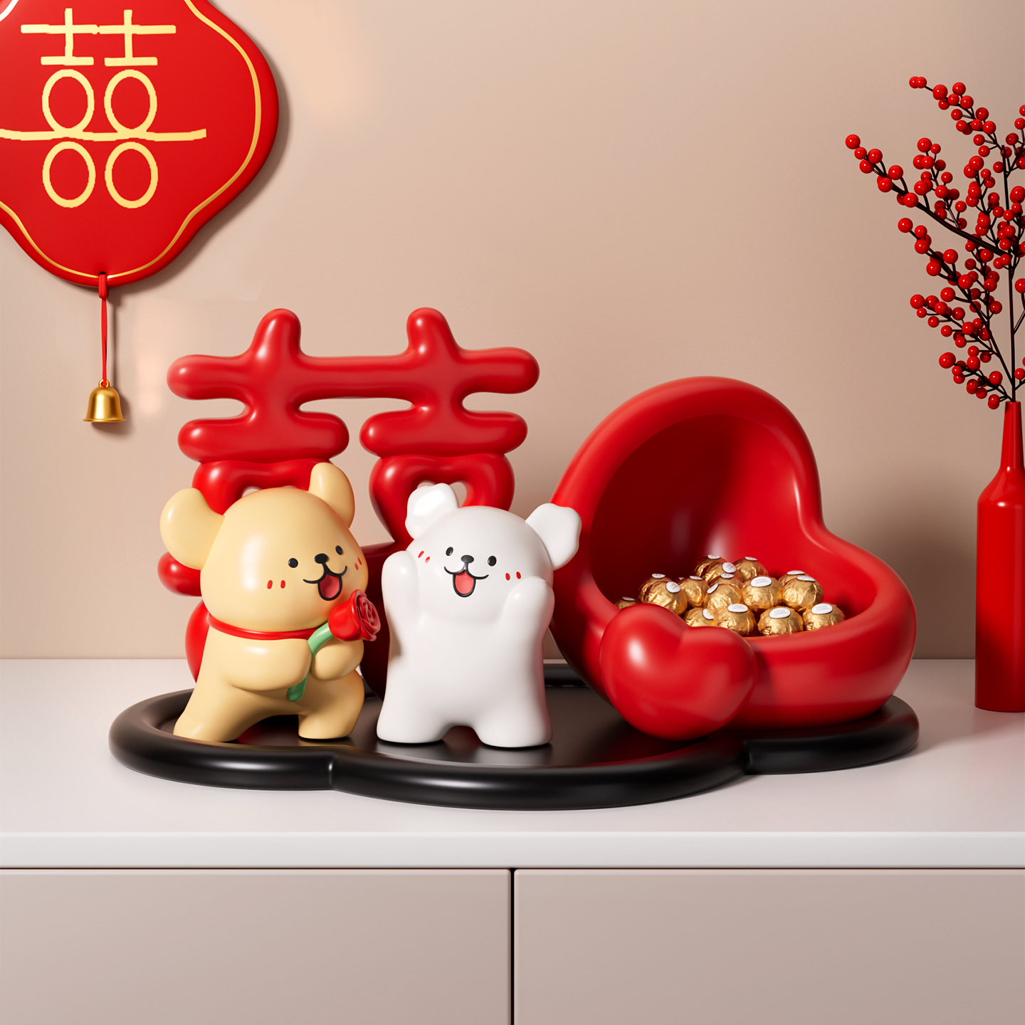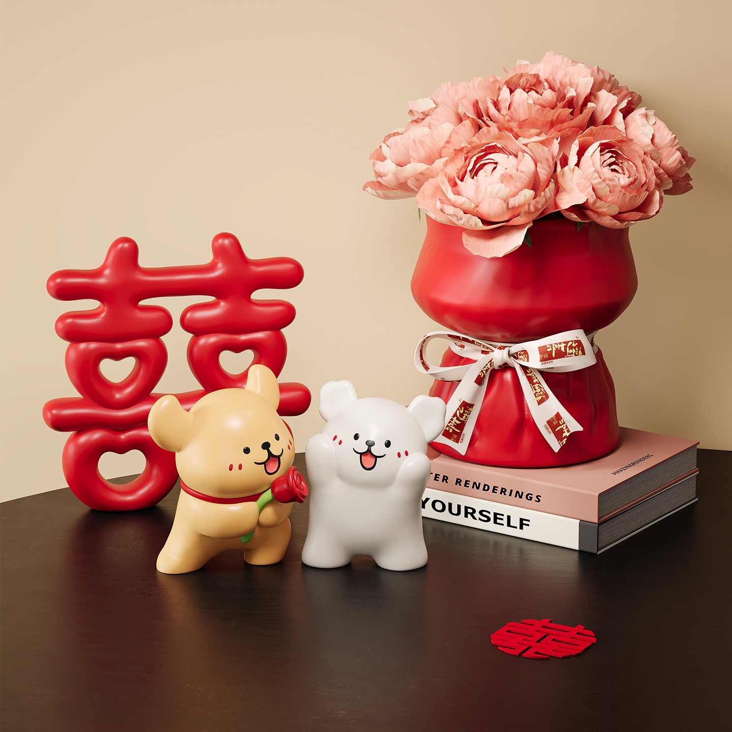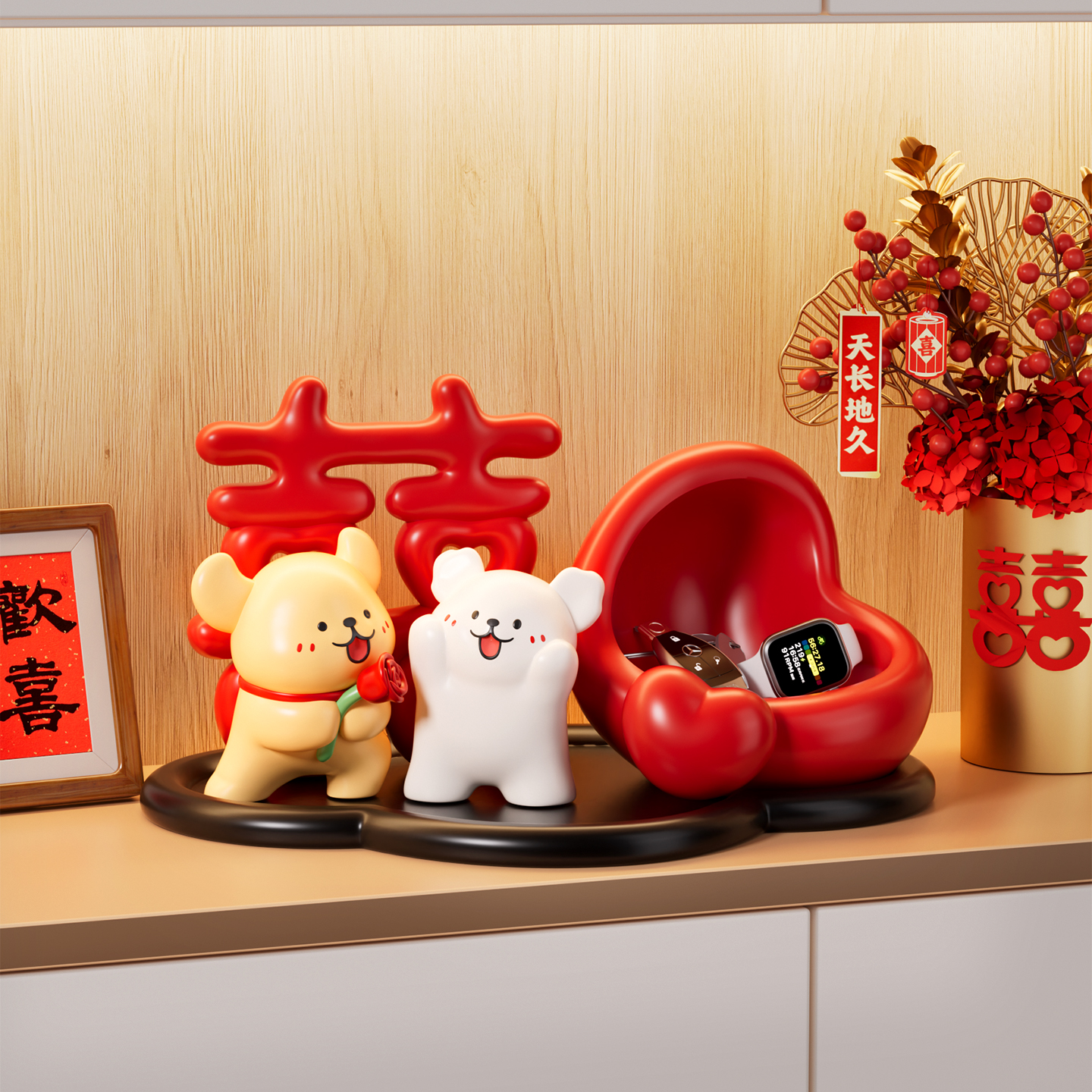 线条小狗喜字新婚礼物摆件订婚结婚送新人喜庆婚房桌面布置装饰品