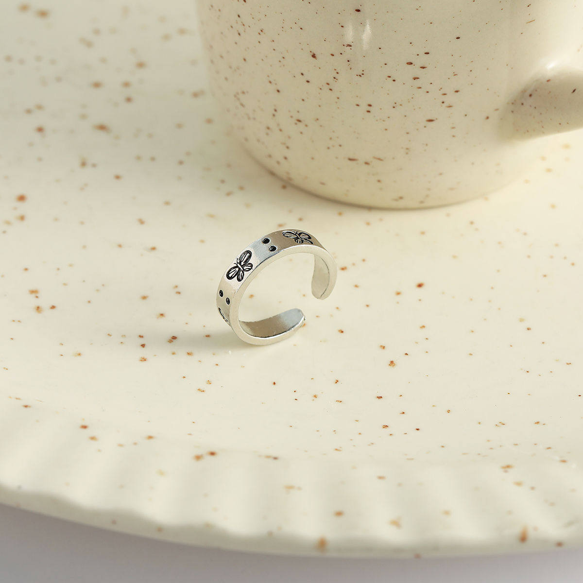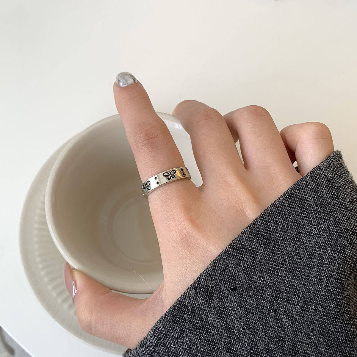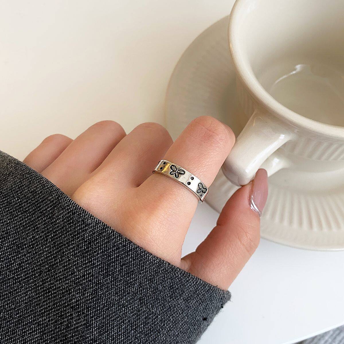 ins风韩国简约轻奢黑色蝴蝶戒指女复古做旧小众设计感开口可调节