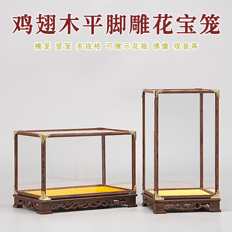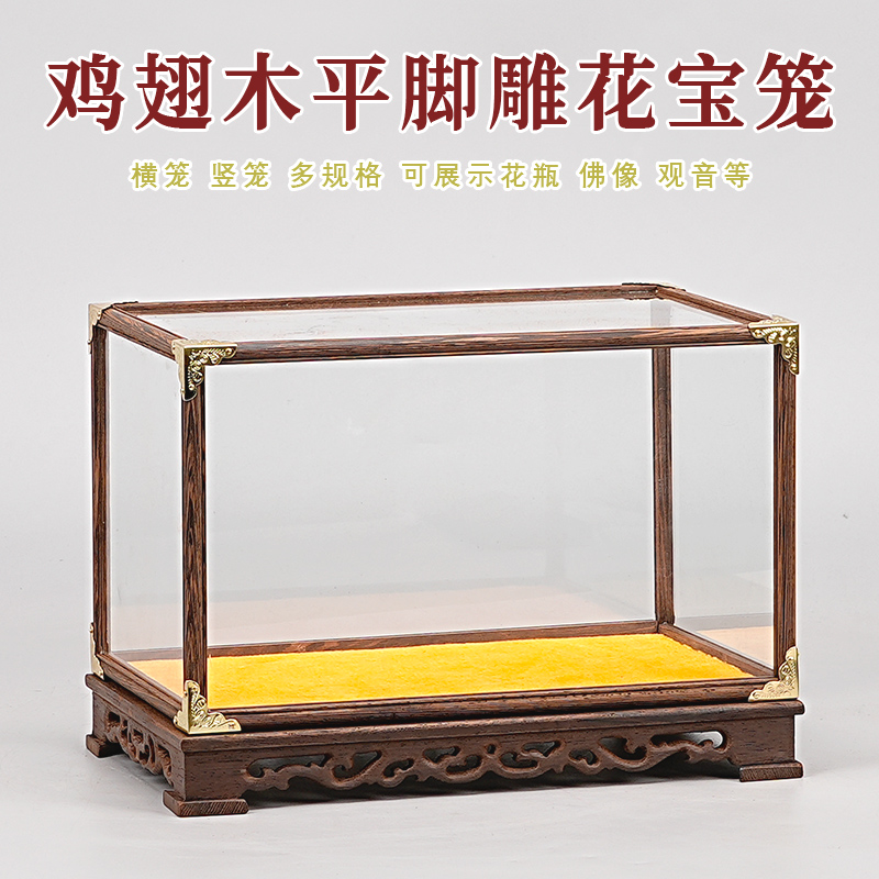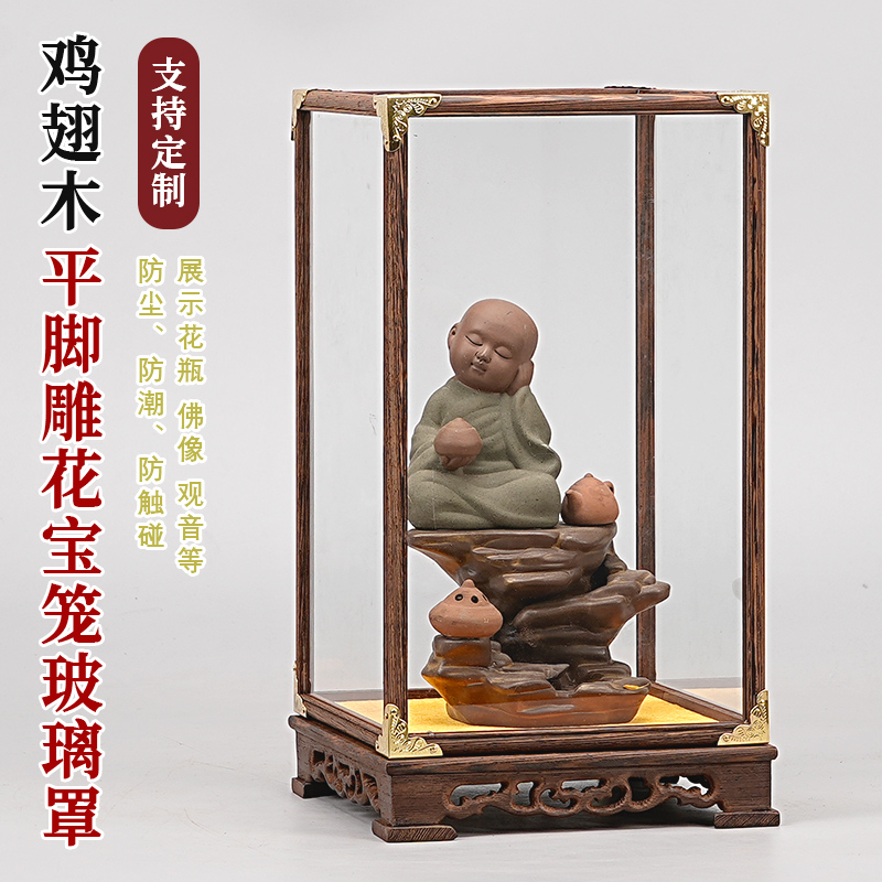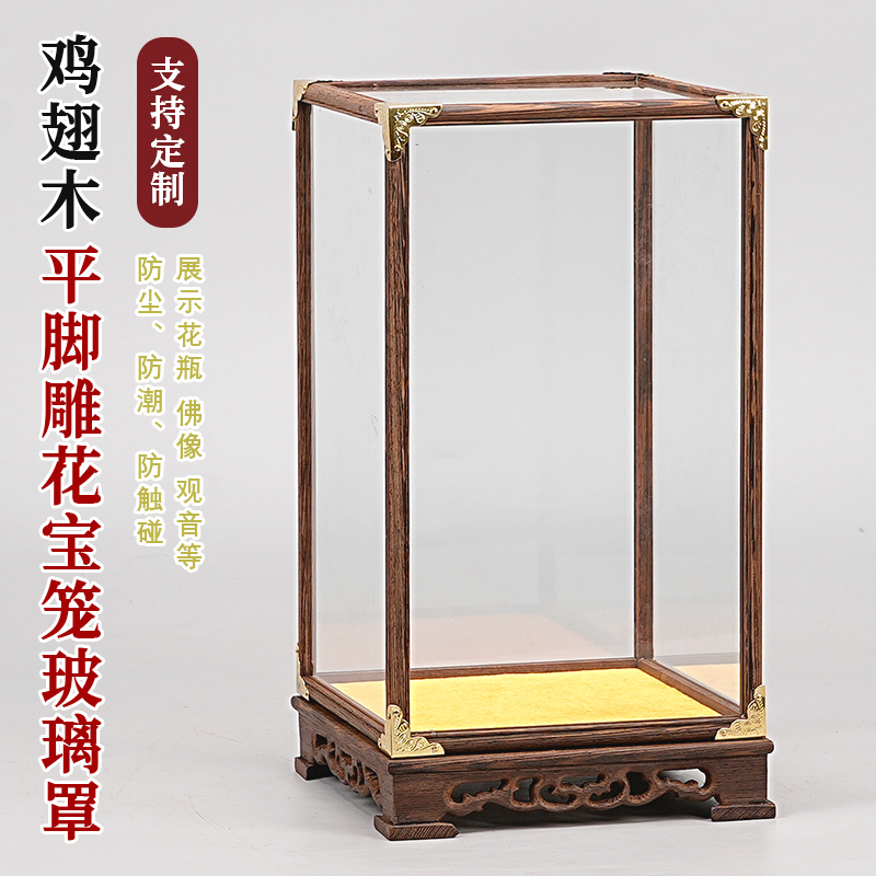 鸡翅木文玩防尘罩雕花玻璃罩花瓶古董佛像摆件宝笼透明展示盒定制
