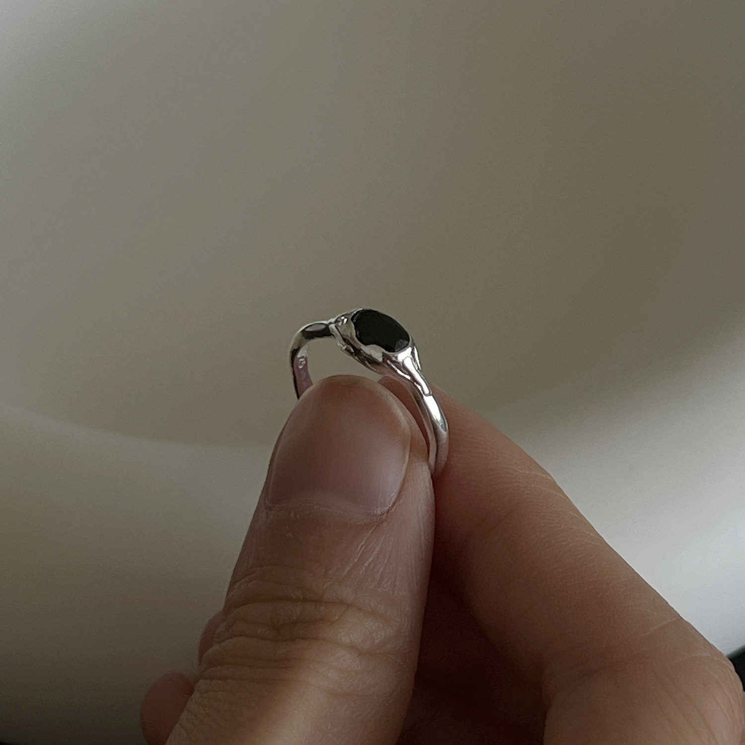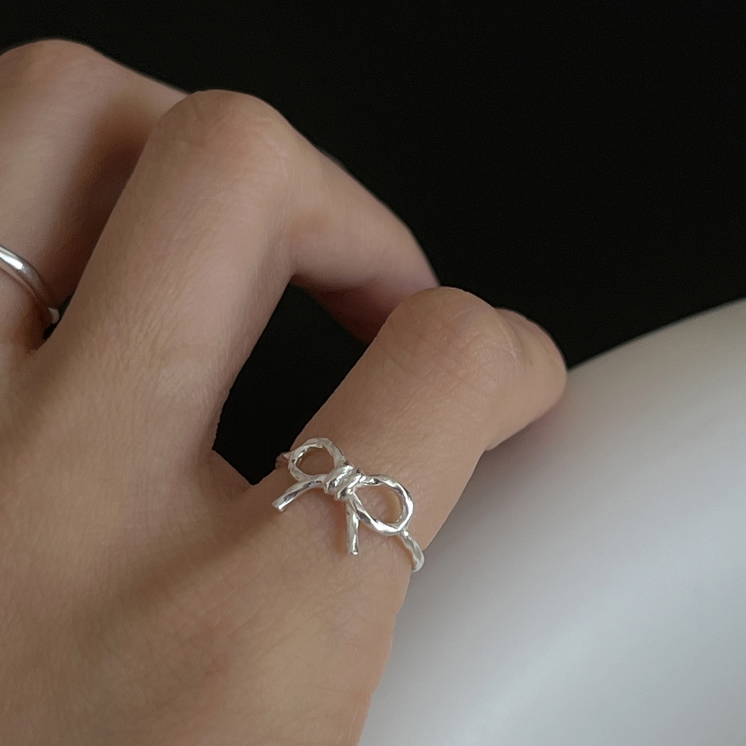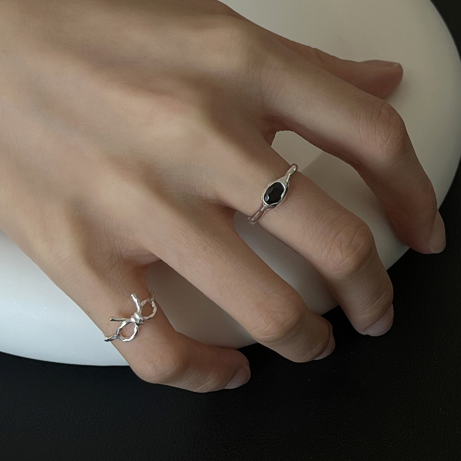 S925纯银甜酷黑色锆石戒指女开口指环简约甜美气质蝴蝶结个性尾戒
