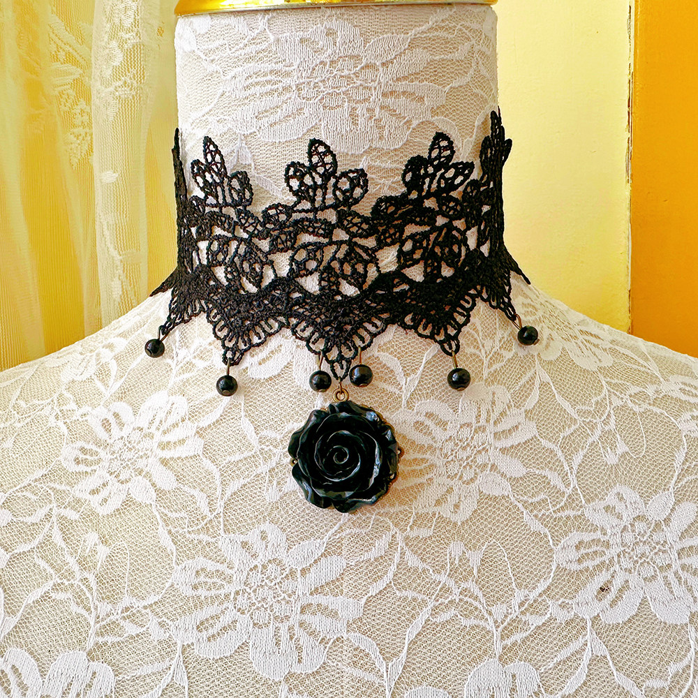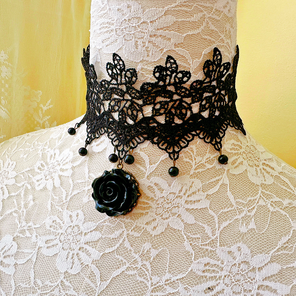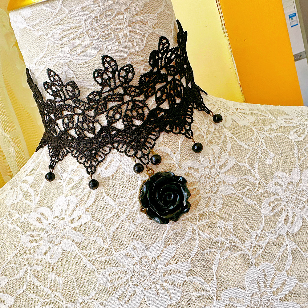 哥特风蕾丝颈链女黑色花朵吊坠项链时尚颈饰品LSXL010