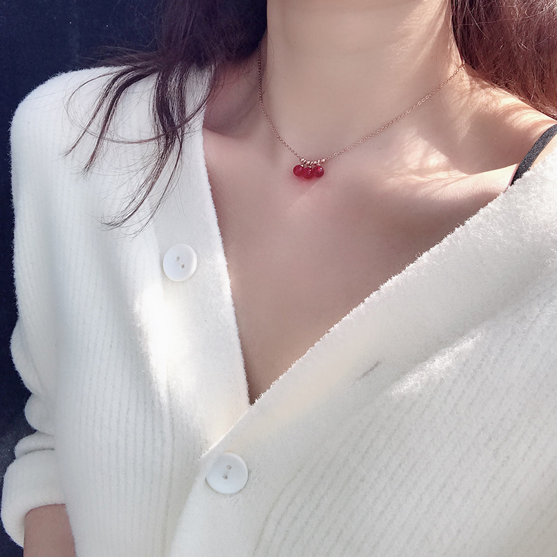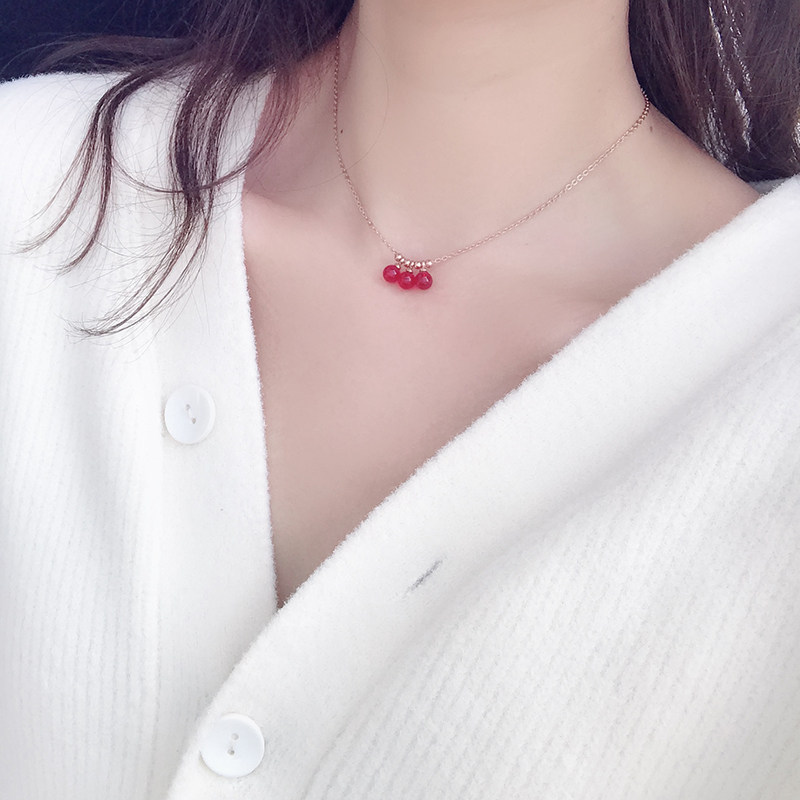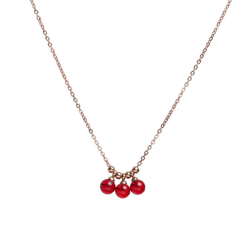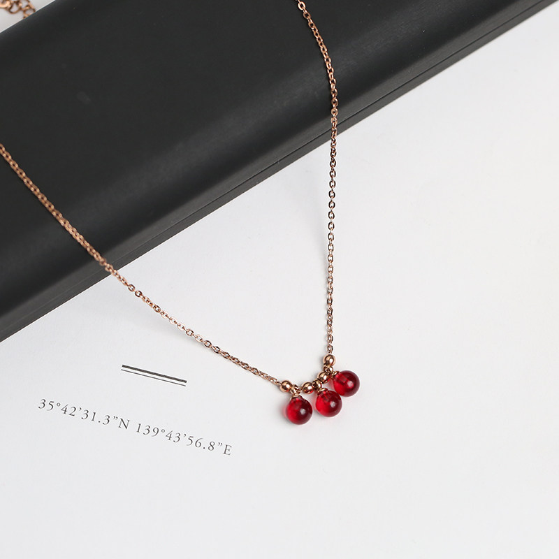 韩版红色珠子项链女短锁骨链网红个性潮钛钢镀18K玫瑰金饰品