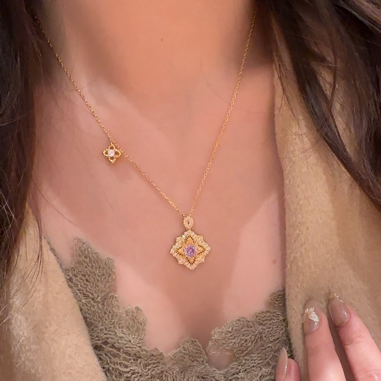 古典风金色拉丝紫色烟花四叶花吊坠项链女轻奢小众2026新款锁骨链