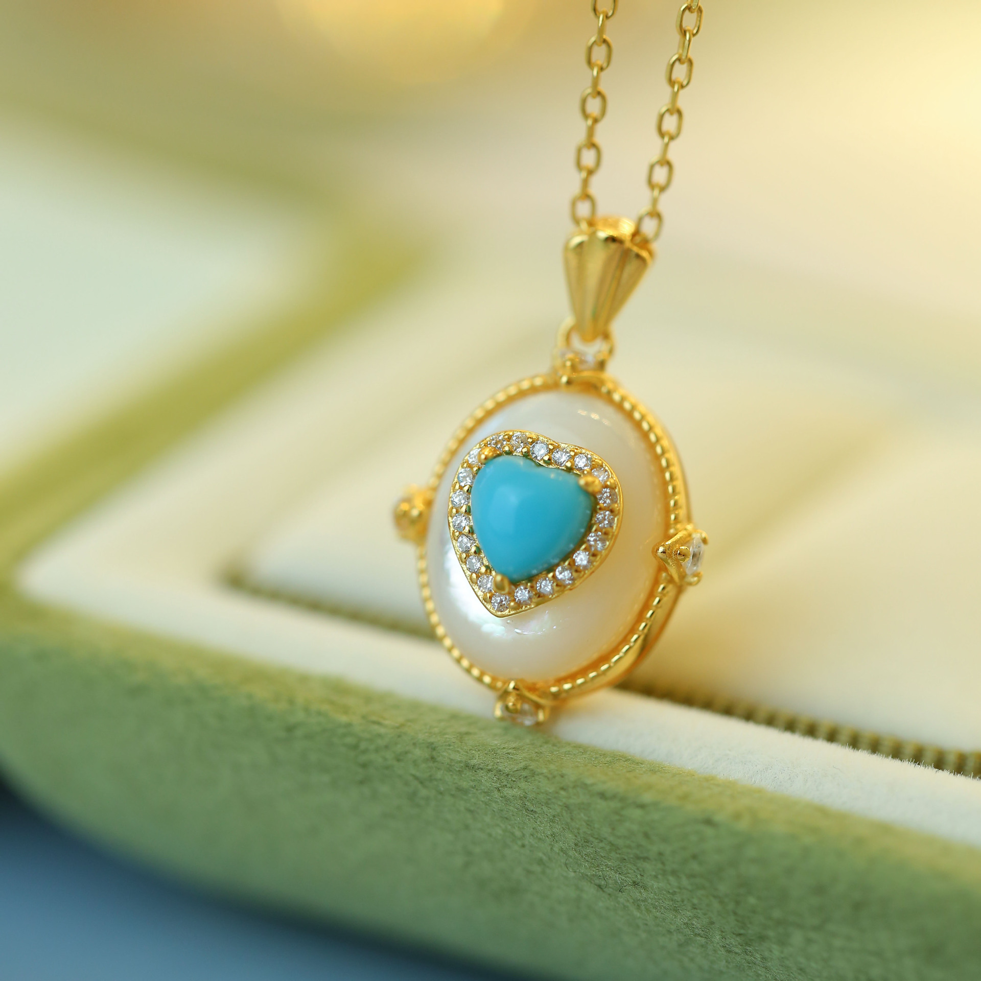 S925纯银镀18k金绿松石青金石白贝爱心吊坠法式复古轻奢赫本风