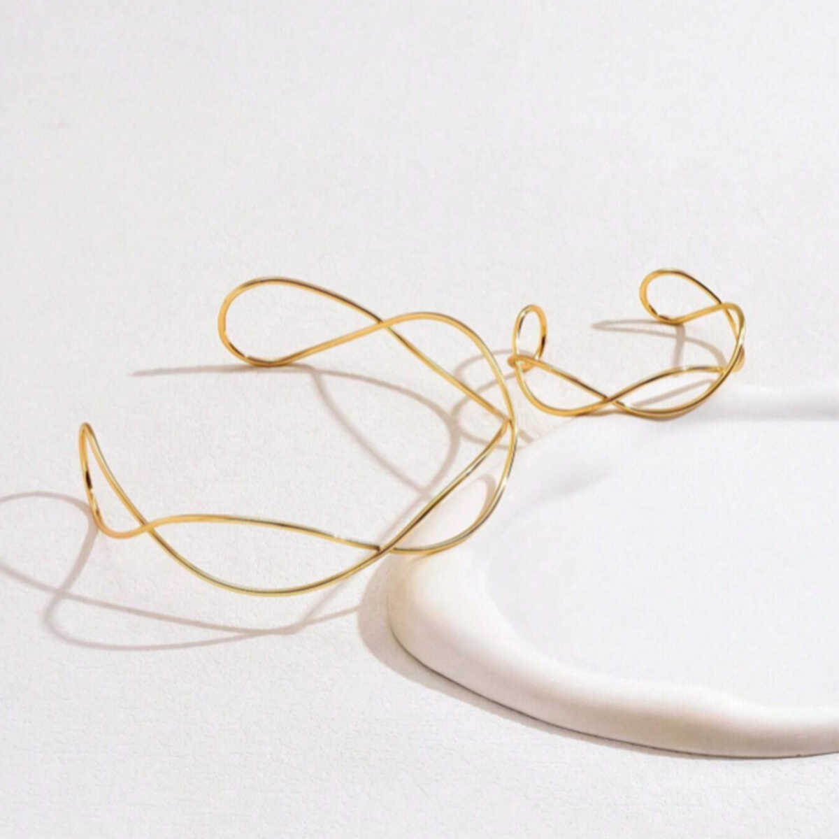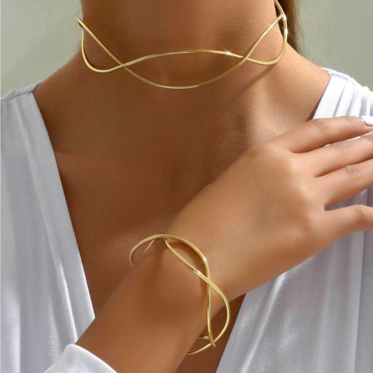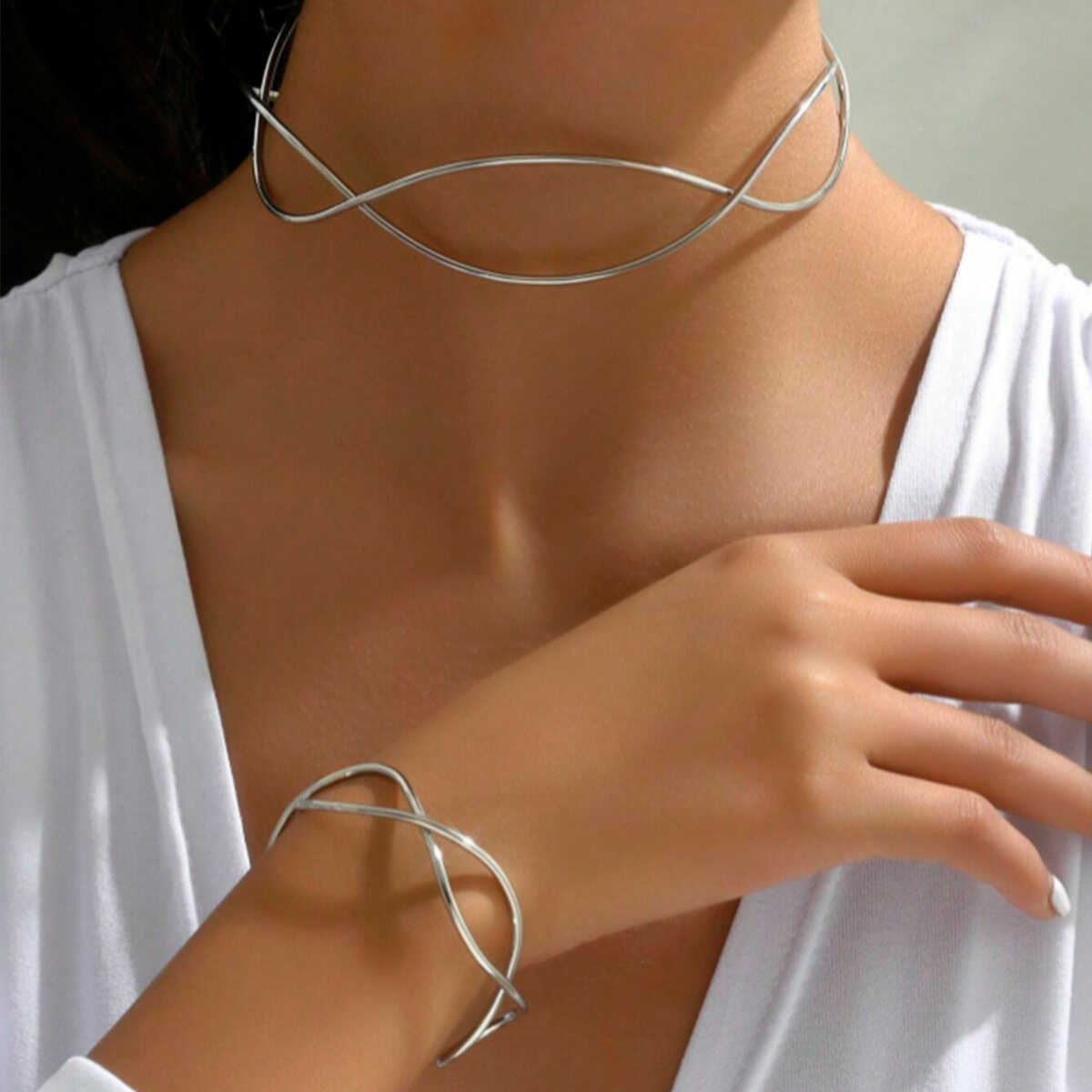双层交叉项圈金色和银色线条交叉手镯开口可调节式女士个性项圈