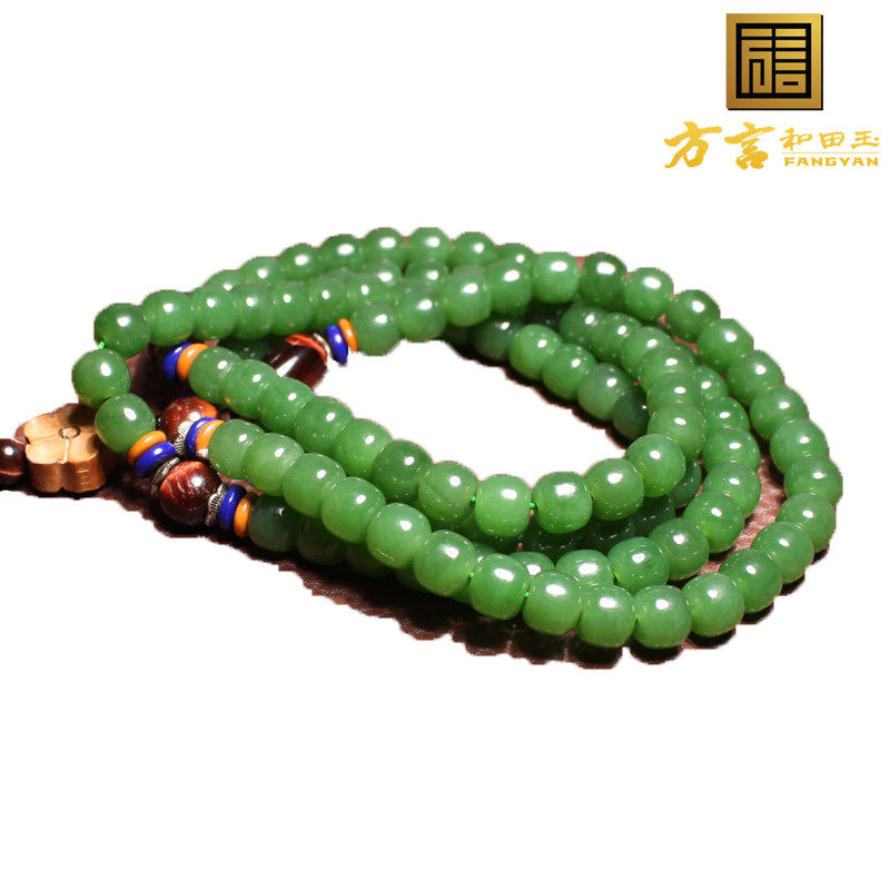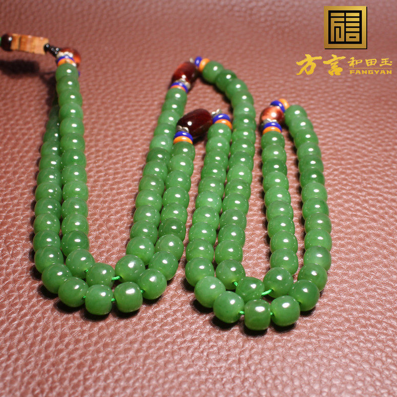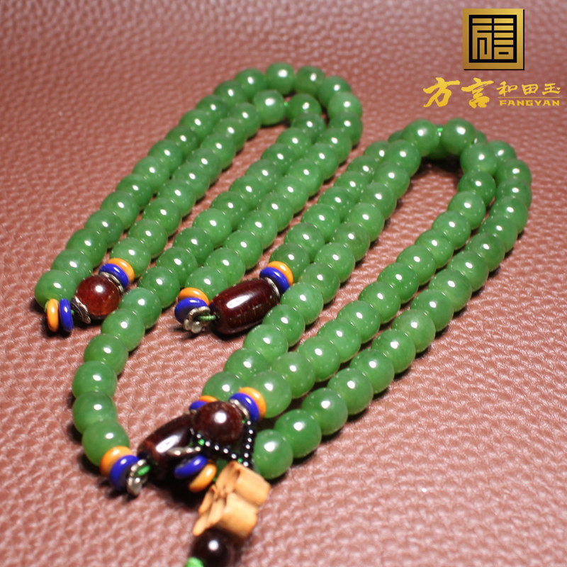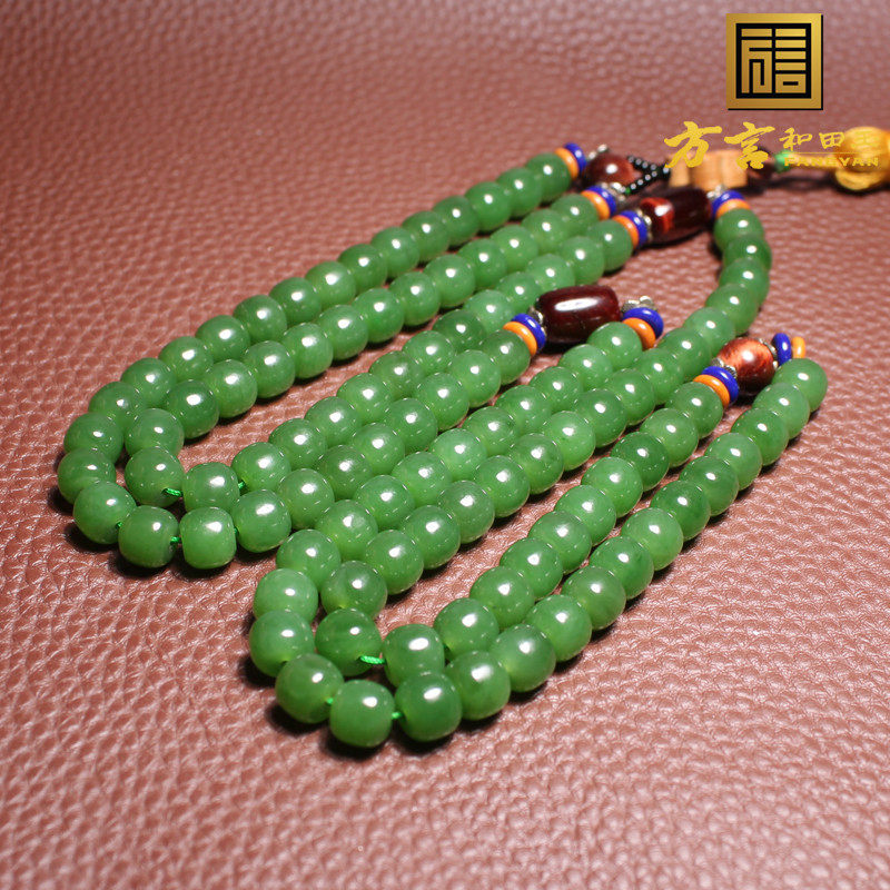 方言和田玉精品俄罗斯老坑菠菜绿色碧玉老型珠108项链多圈手串A2