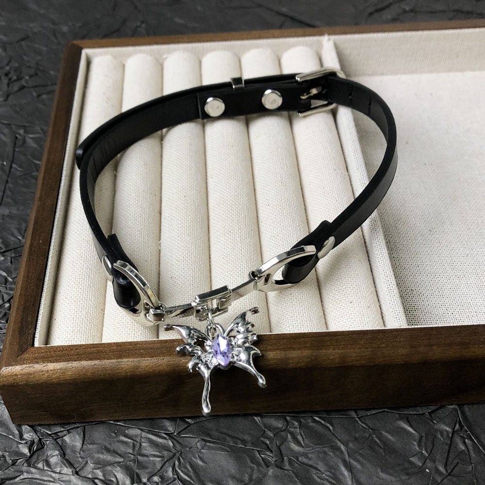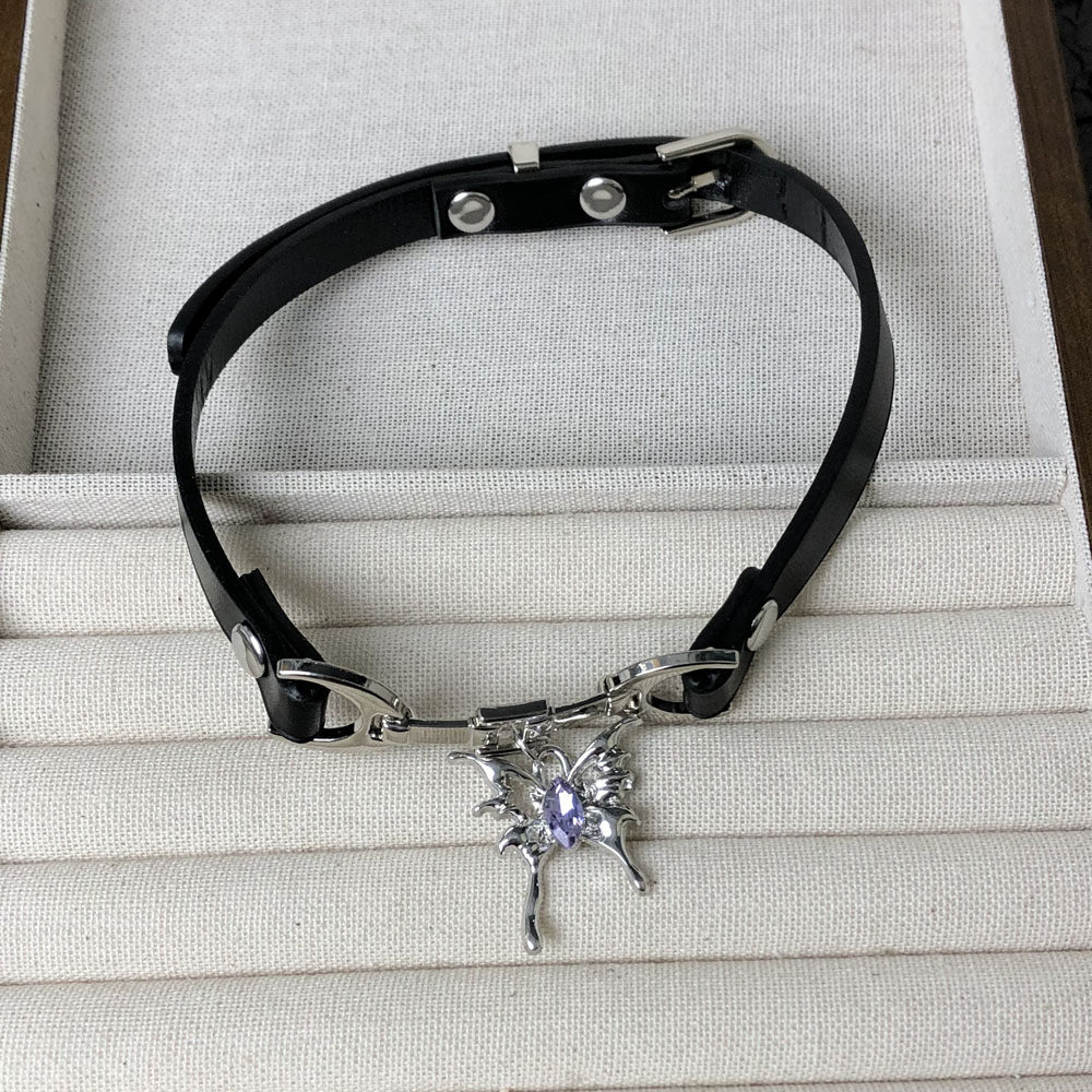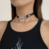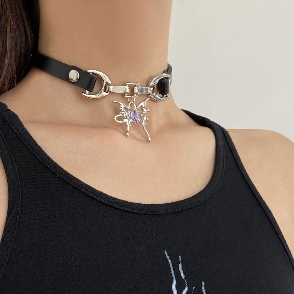 时髦辣妹皮质短chocker金属锆石蝴蝶坠项圈黑色皮带扣锁骨项链潮