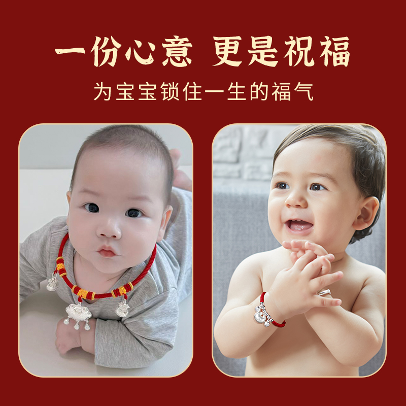 宝宝项圈编绳纯银婴儿银锁吊坠平安锁项链小胖福手链满月周岁礼物