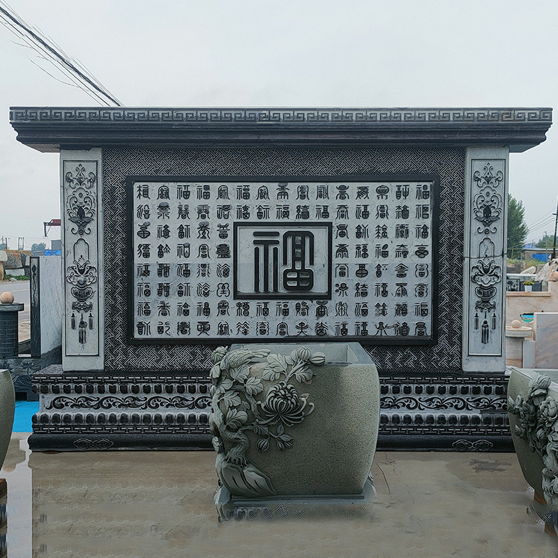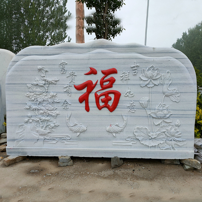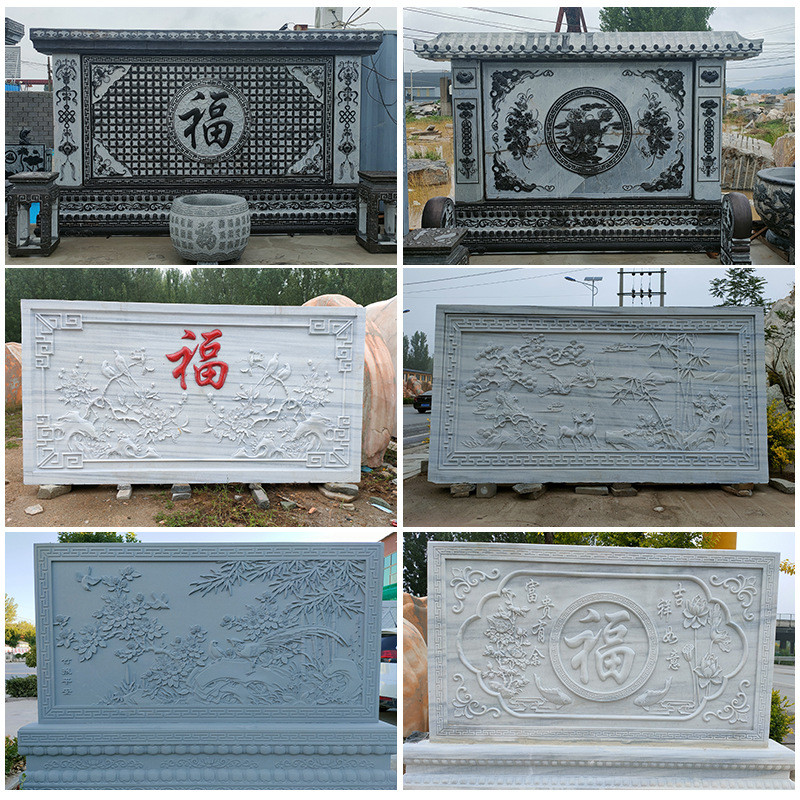 青石壁画影壁墙晚霞红浮雕百福图案四合院石头屏风汉白玉背景墙