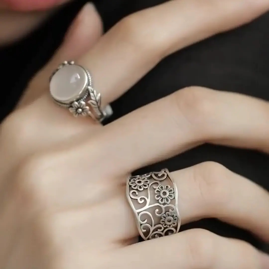 合金戒指 新中式戒指复古花朵树叶气质白月光开口可调做旧手工