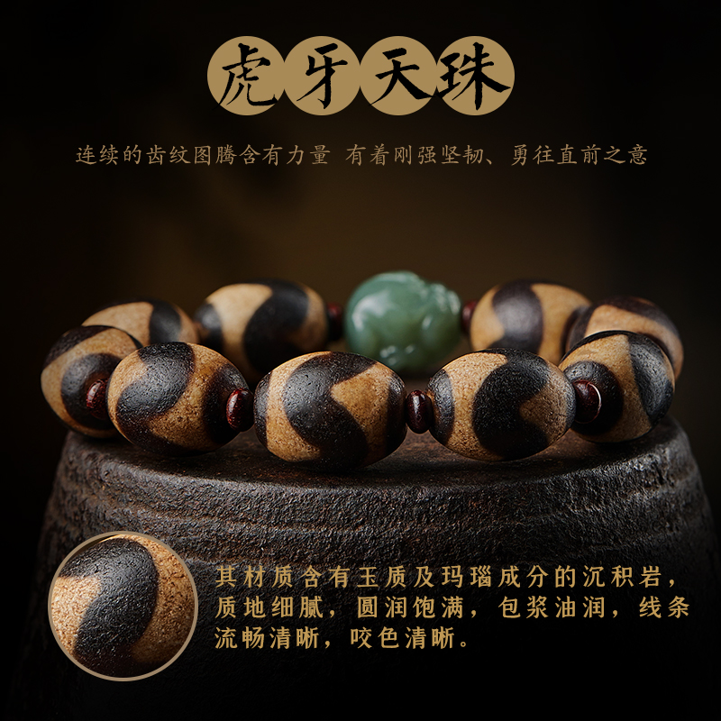 虎牙天珠手串天然西藏真品文玩佛珠男和田玉貔貅手链盘玩转运珠女