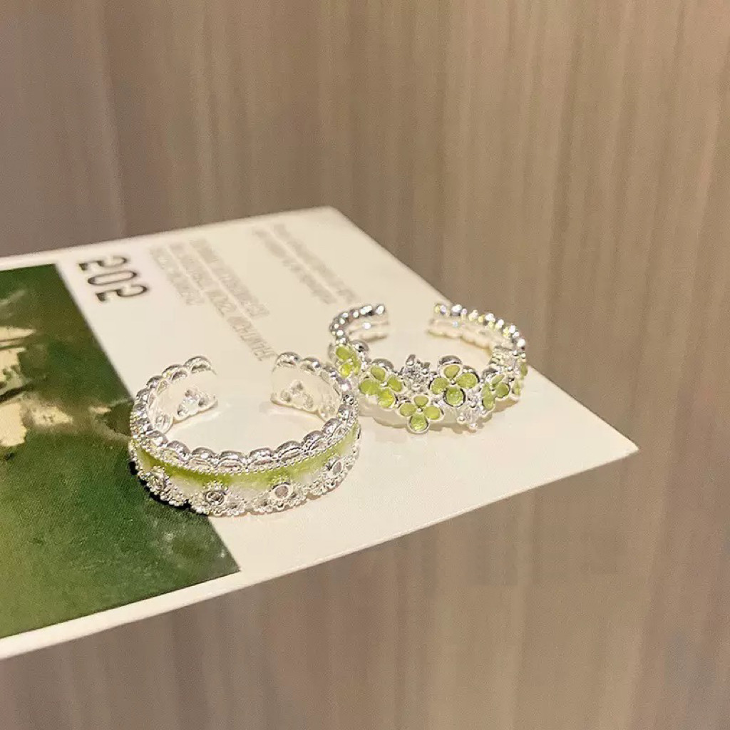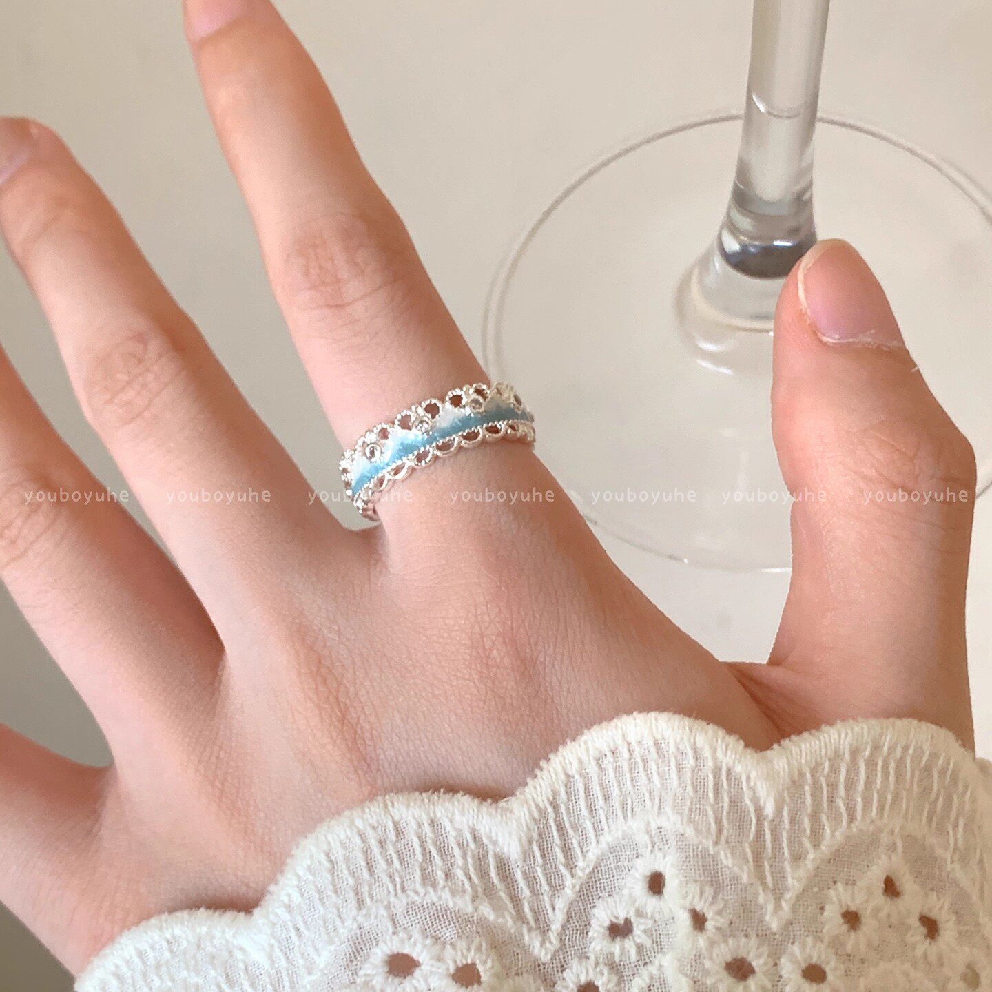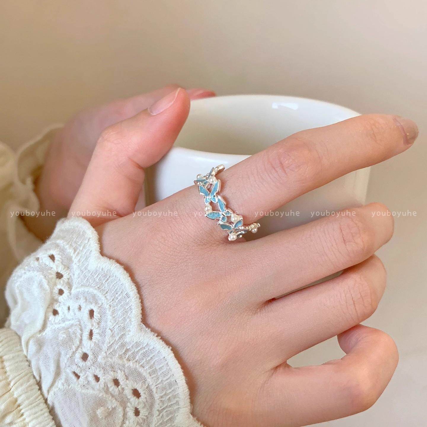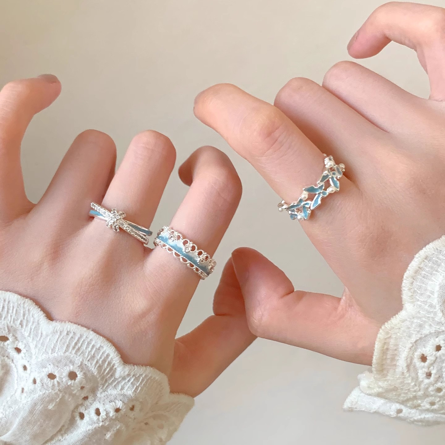EmoPluto「蓝色滴釉」蕾丝花边叠戴戒指小众设计开口戒指套装2026