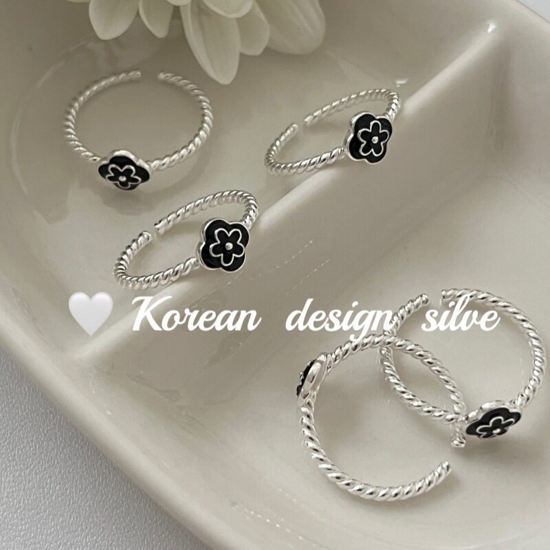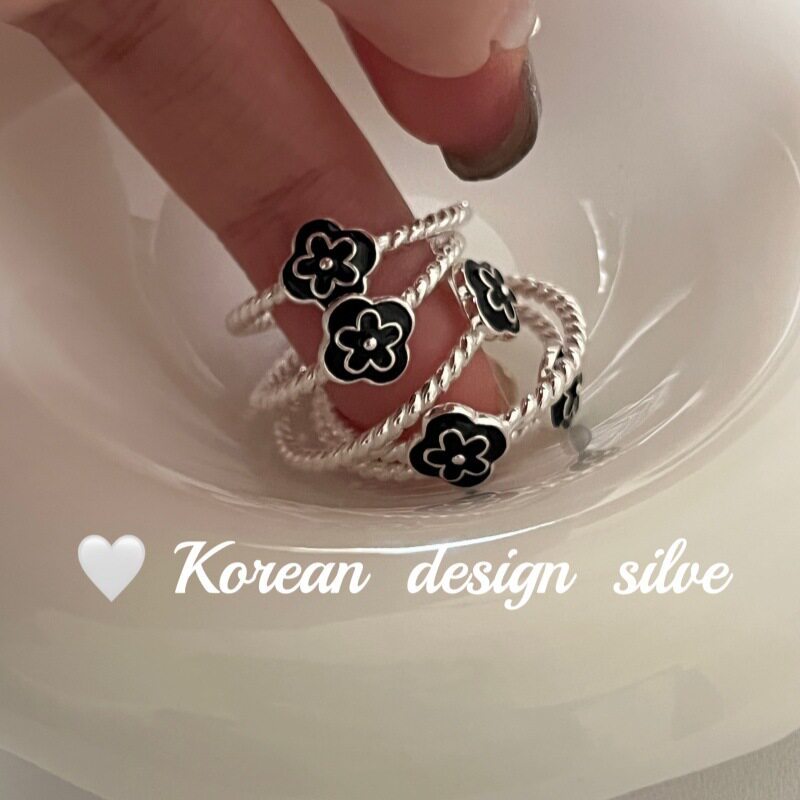 韩国东大门ins风银饰品 S925纯银黑色滴釉花花戒指气质开口食指环