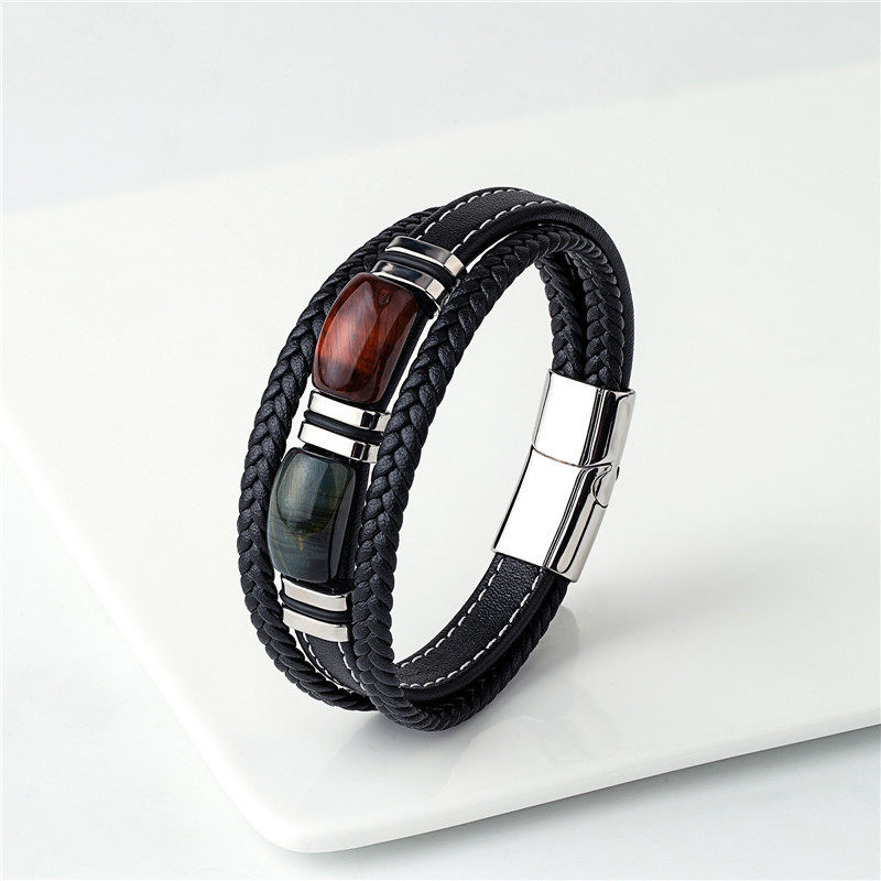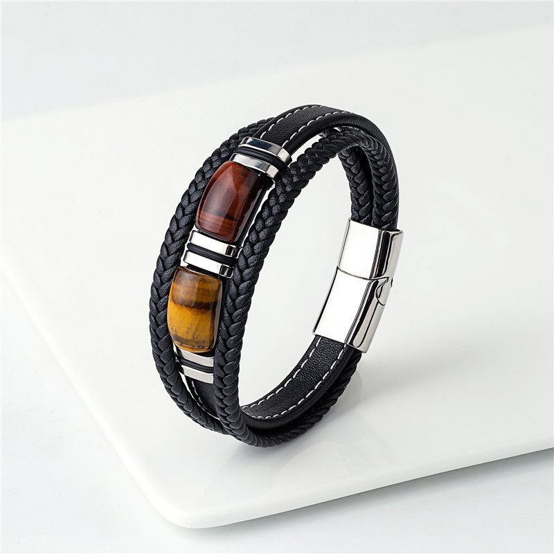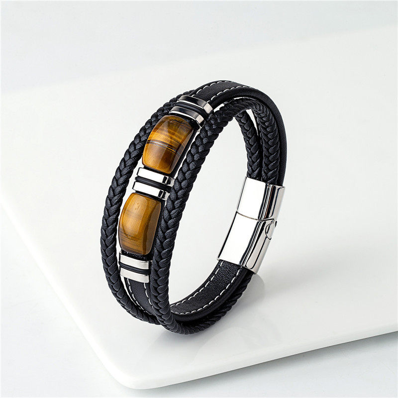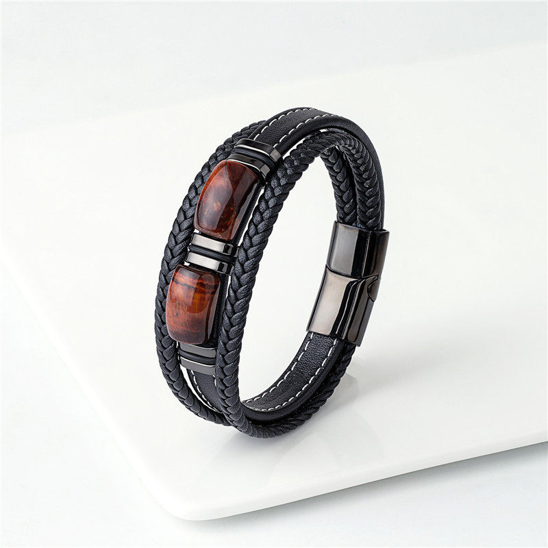 男士帅气高档黑咖紫色多层皮绳编织手绳小众气质玛瑙石手环礼物潮