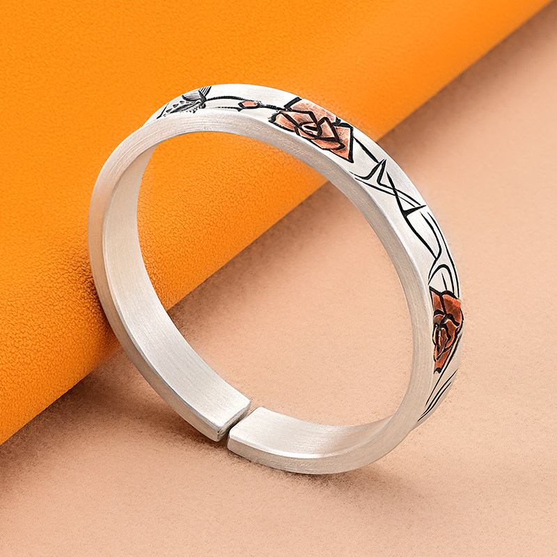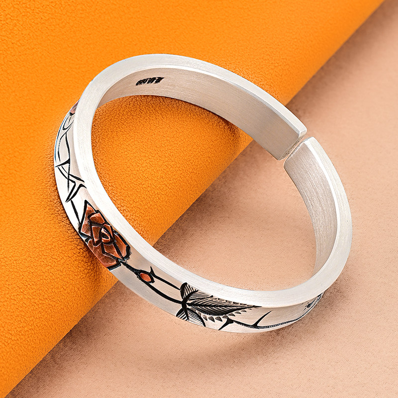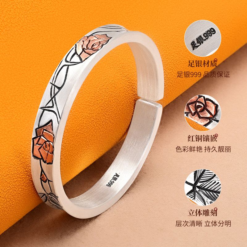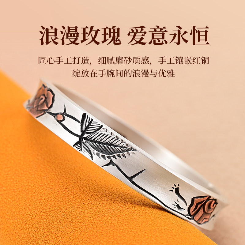 银千造 绯红 手工玫瑰花足银999银手镯传承银镯子2025新款女手环