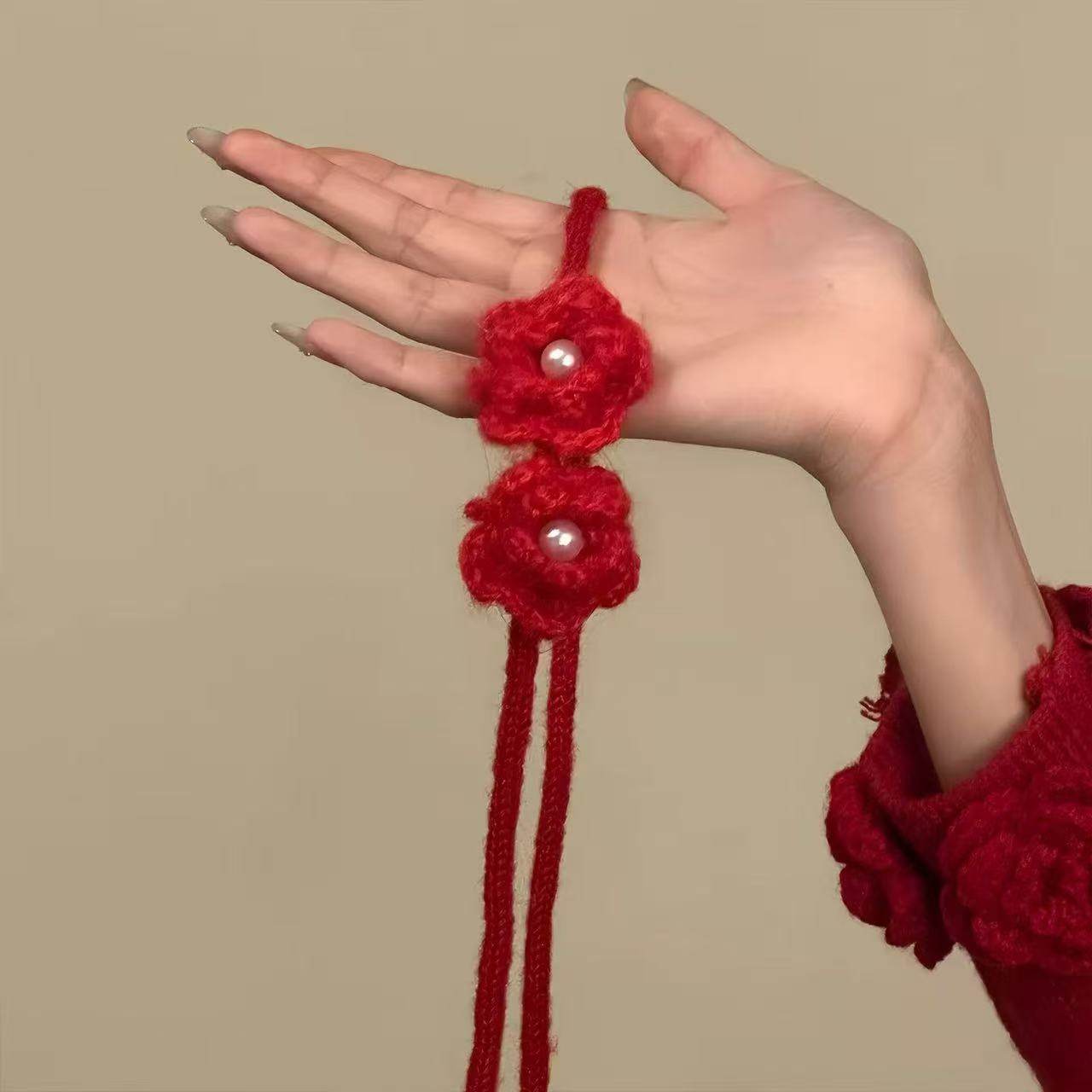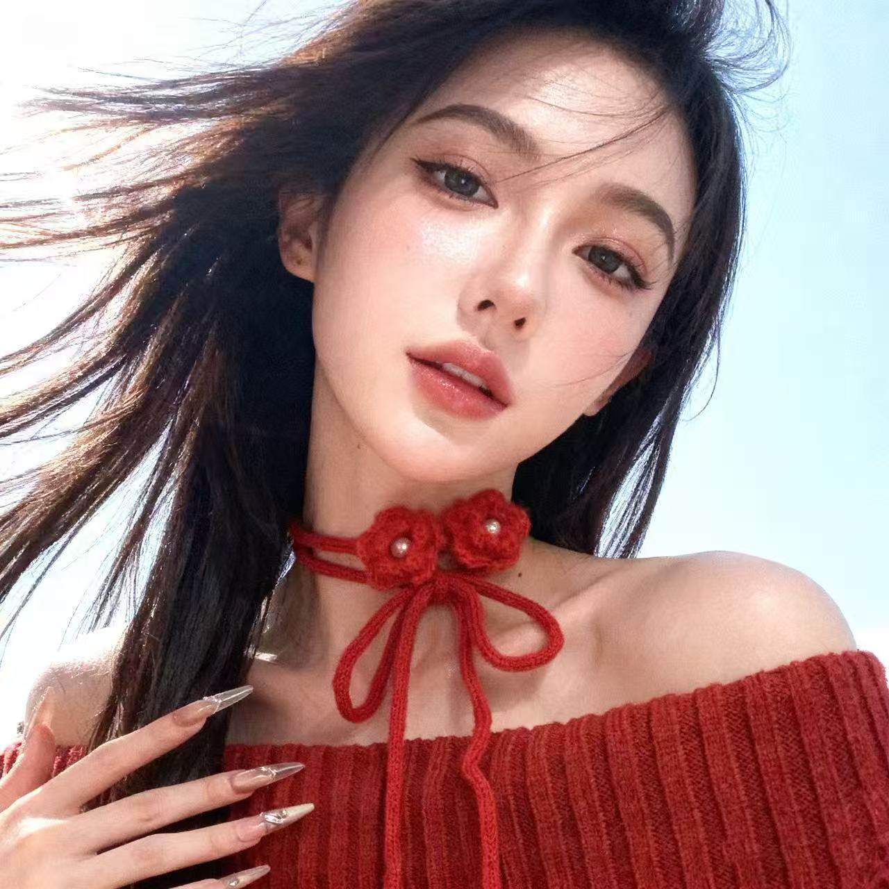 2025秋冬圣诞节红色针织毛绒花朵颈带choker项链女秋冬长款毛衣链