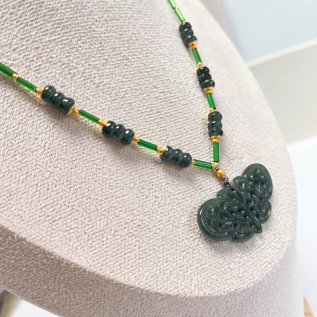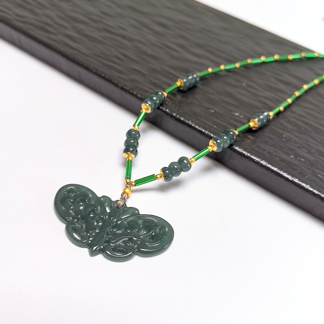 D1495# 天然A货蓝水翡翠蝴蝶吊坠 配蓝水翡翠盘珠项链 沙金配件
