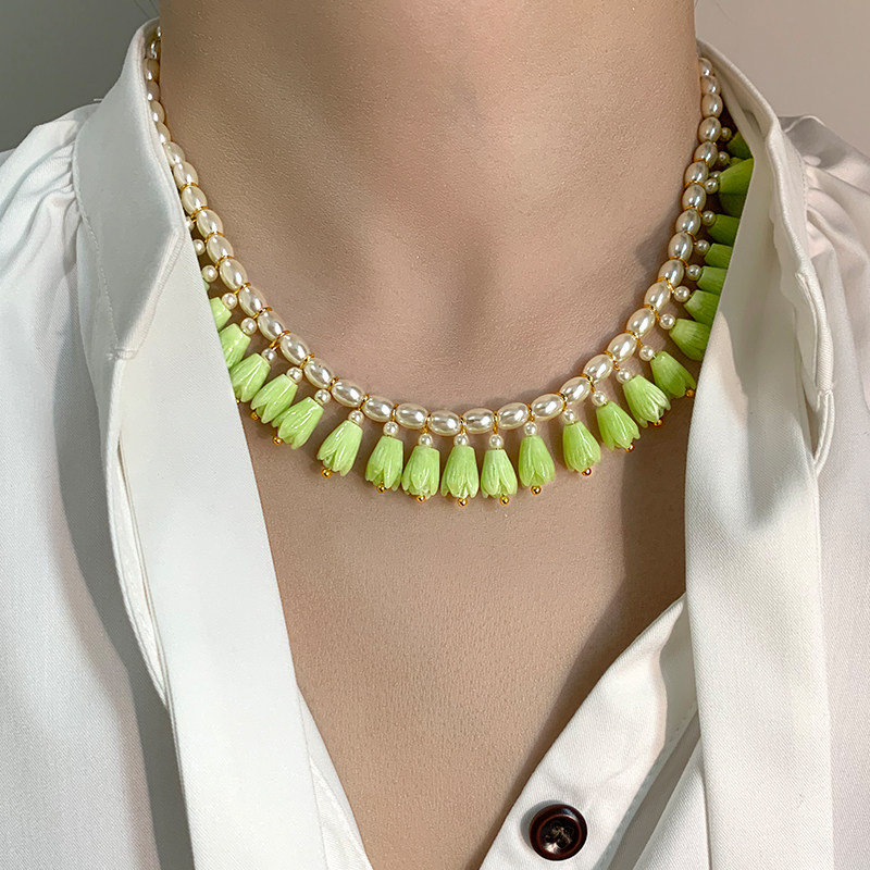 铃兰花项链女气质小众绿色郁金香清新花朵锁骨链手工珍珠吊坠配饰