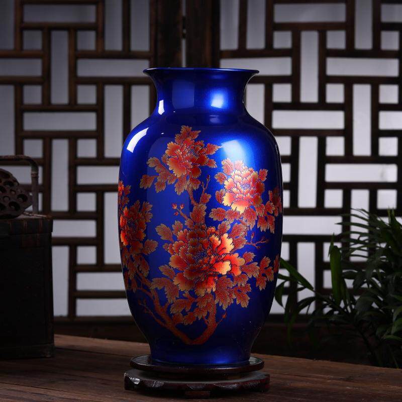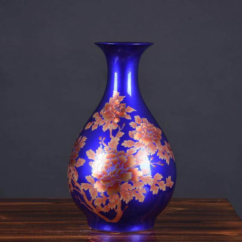 装饰陶瓷器蓝色水晶釉冬瓜瓶花开富贵花瓶现代家居工艺品景德镇