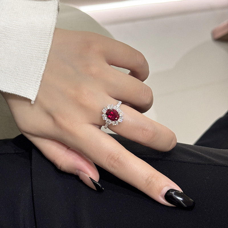 高级感气质2克拉红宝石戒指圆钻显白鸽血红围镶镶钻通勤彩宝戒子