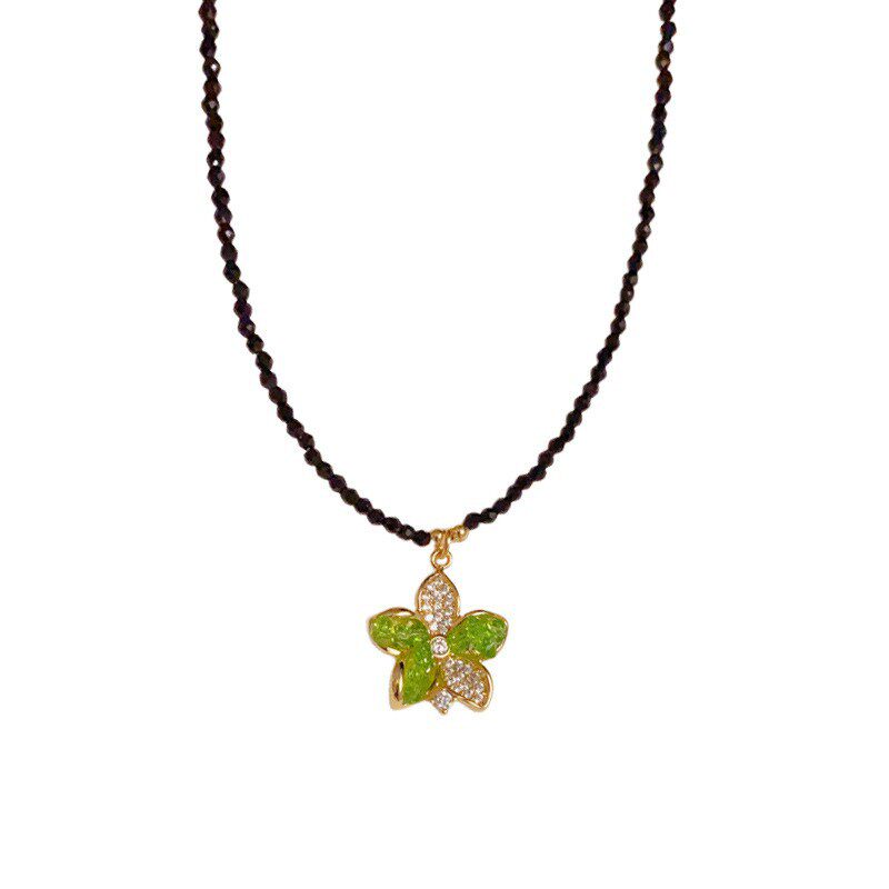 春季新款气质时尚绿色花朵吊坠黑水晶项链个性轻奢百搭高级感颈链