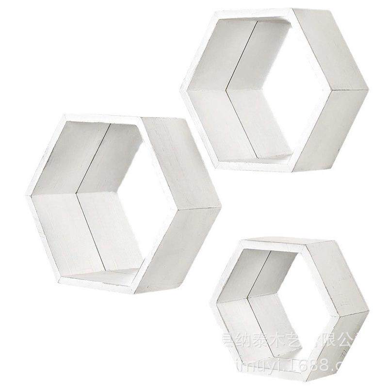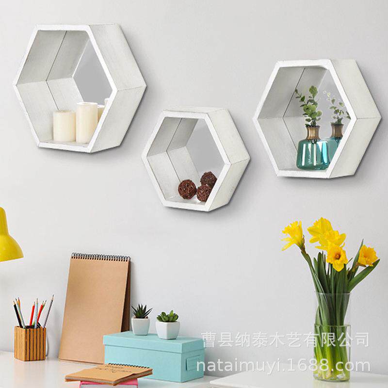 热销安装几何木制金属镜子装饰储物壁架搁架六边形套装壁挂置物架