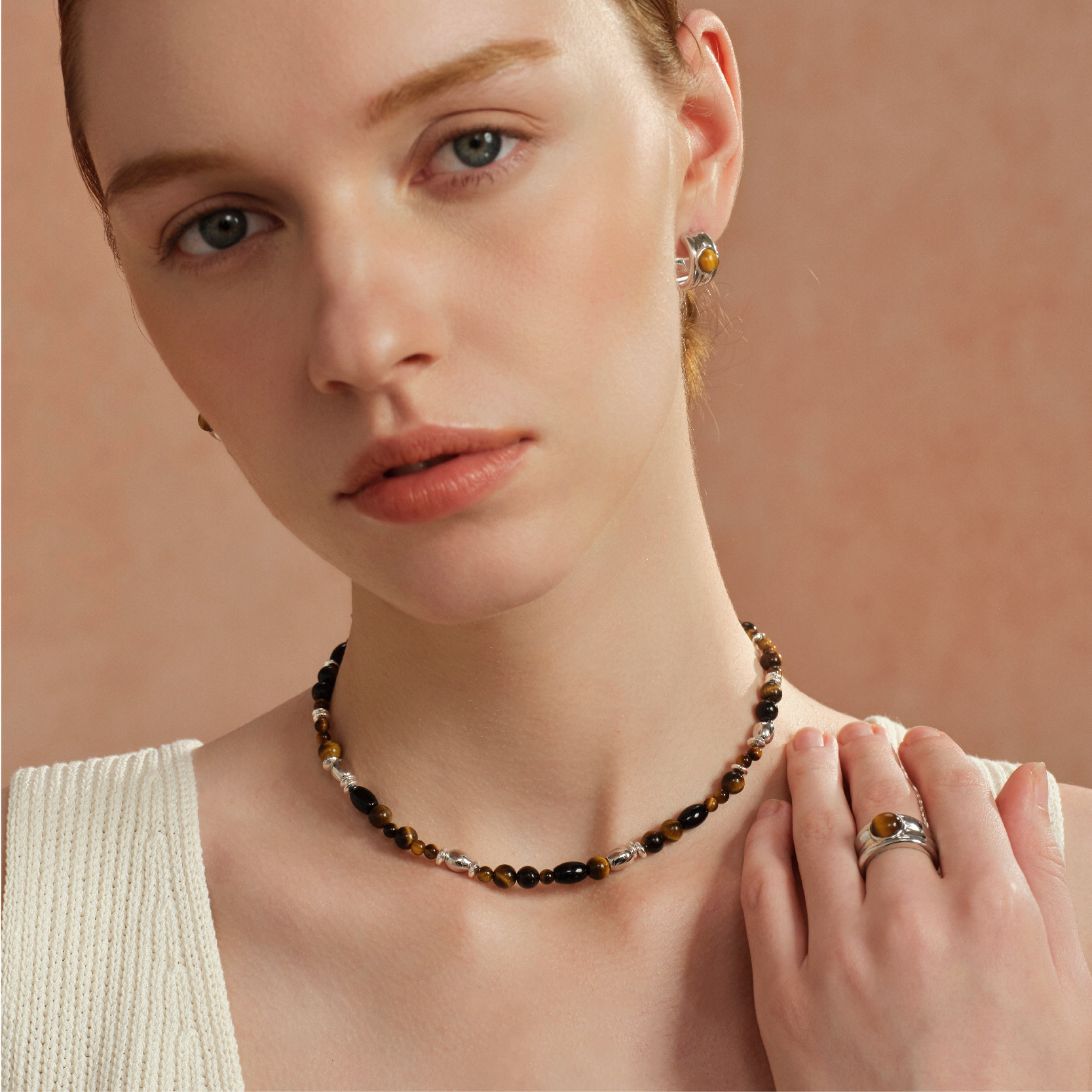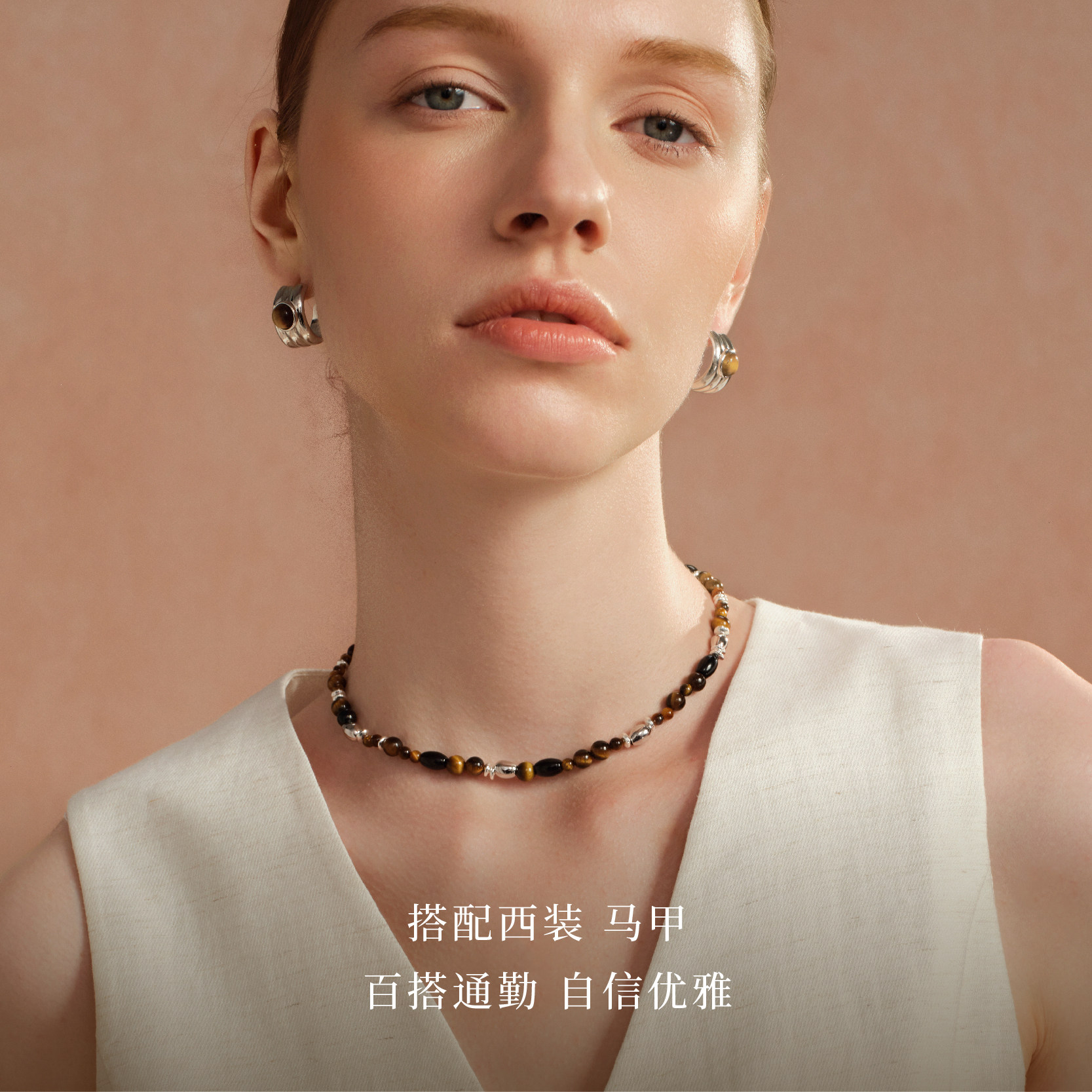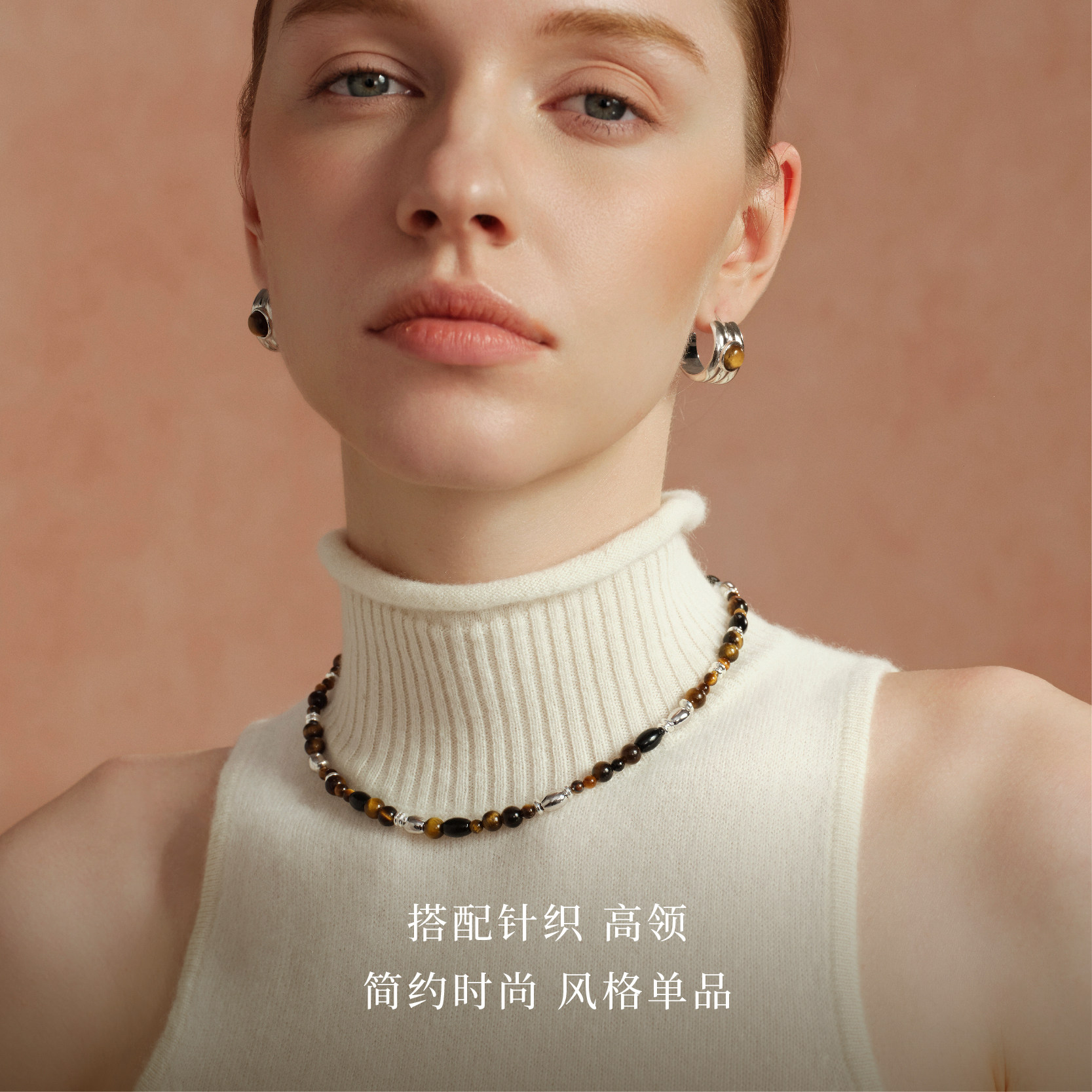Neverfar Essential·秋冬系列虎眼石岩纹串珠项链女款新款高级感
