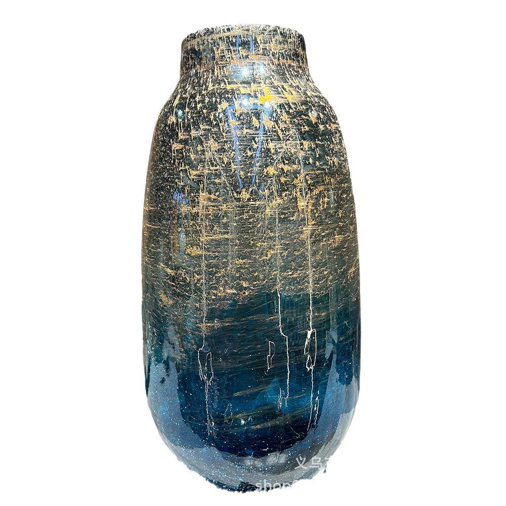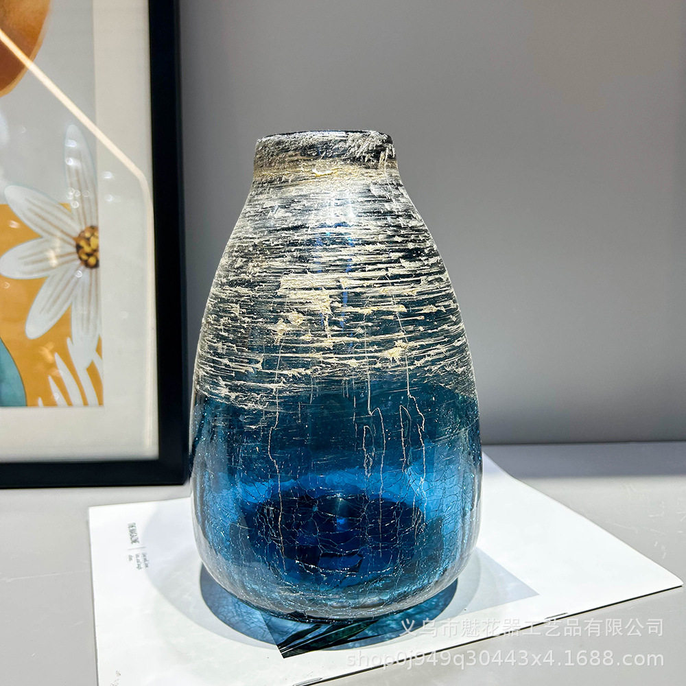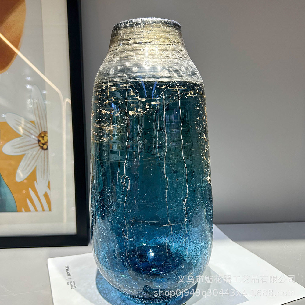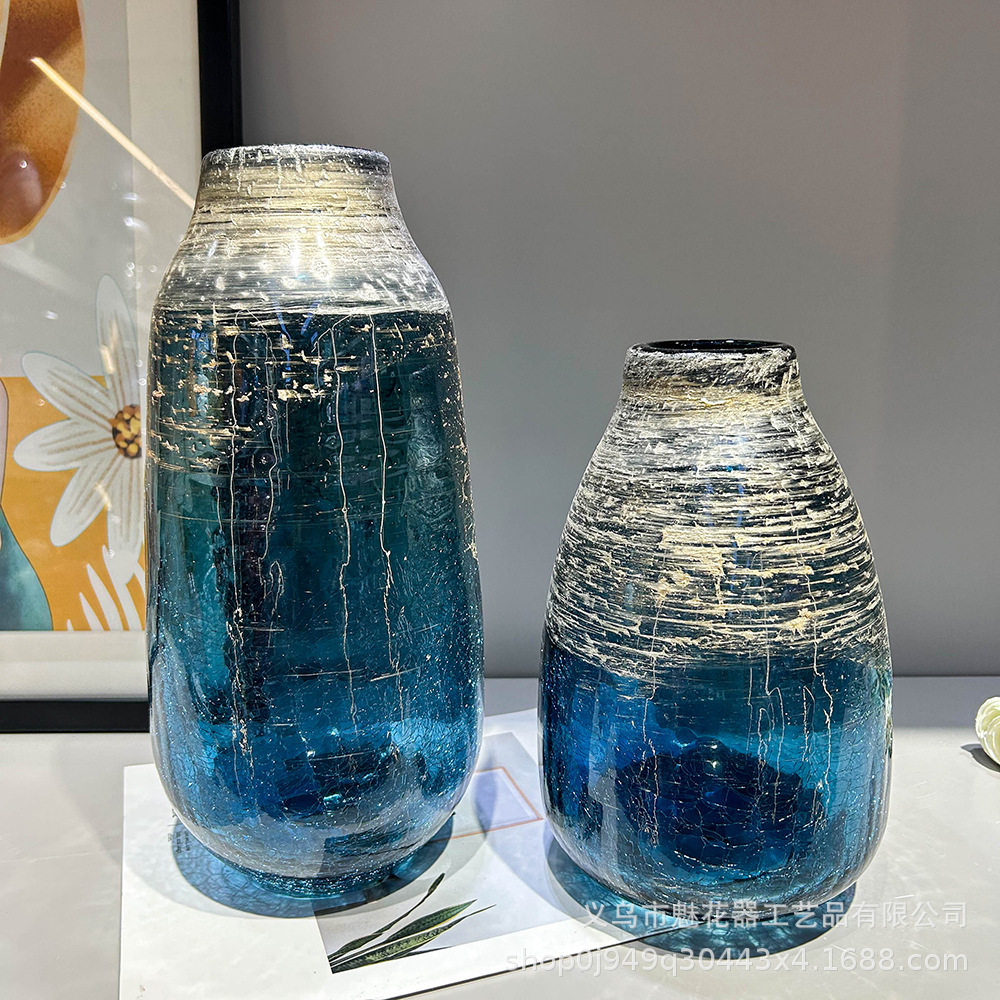 创意轻奢蓝色鎏金冰裂纹手工花瓶家居样板间办公室高级感装饰摆件
