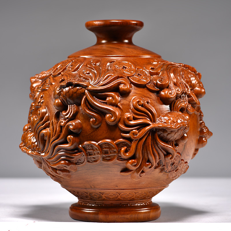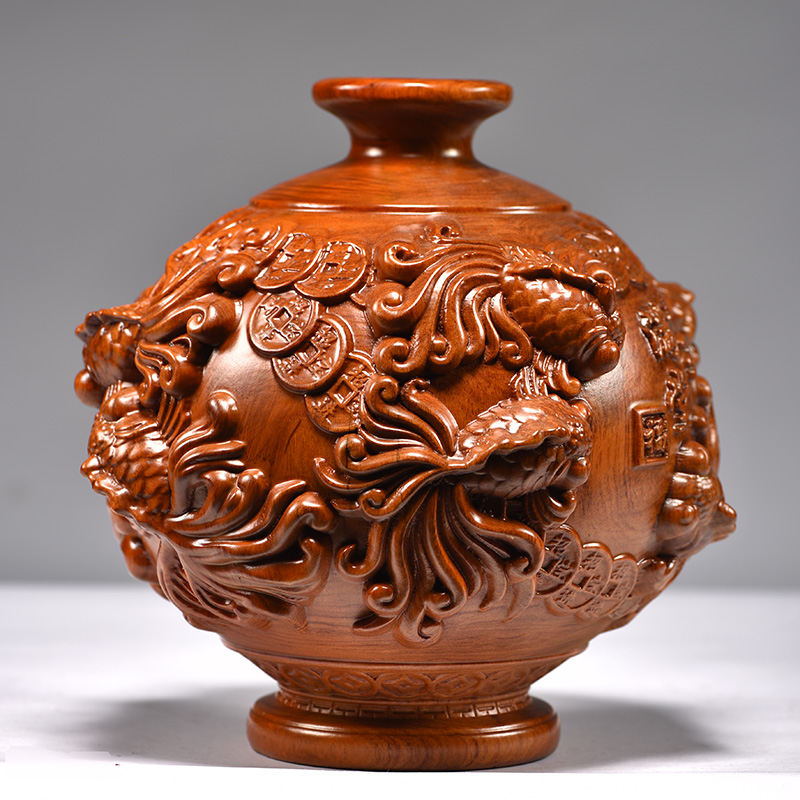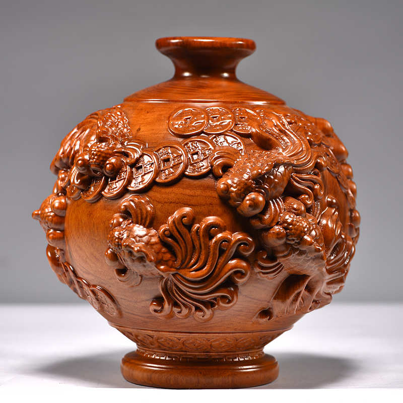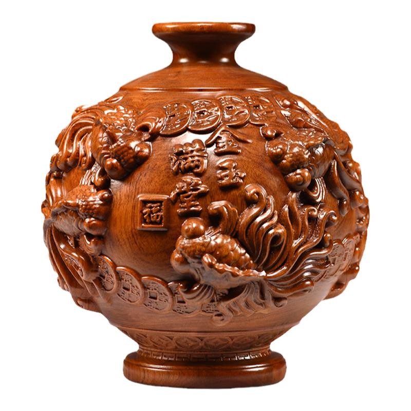花梨木雕金玉满堂花瓶摆件年年有鱼客厅插花装饰家居实木质工艺品