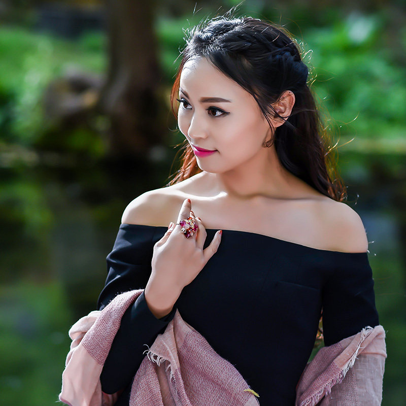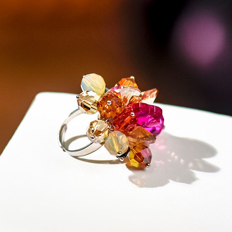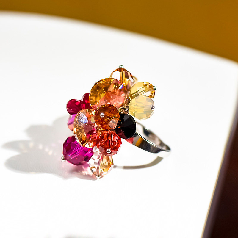 【红尘里】 925纯银红色夸张热烈水晶 花朵戒指可调指环时尚个性