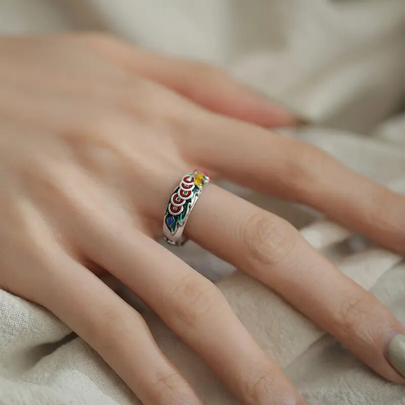 925银复古新中式珐琅彩五帝铜钱戒指环开口调节女小众设计高级感