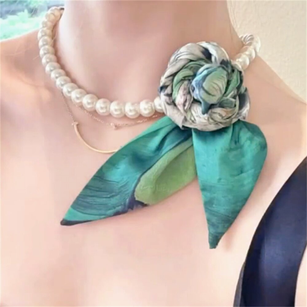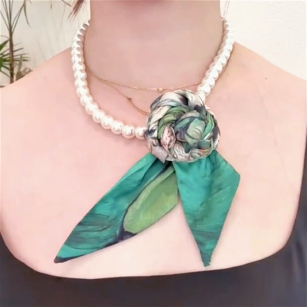 zoozmini绿色丝巾珍珠叠带搭配围巾丝带飘带高级感系脖子配饰颈饰
