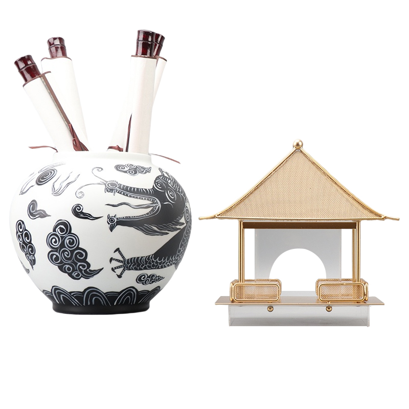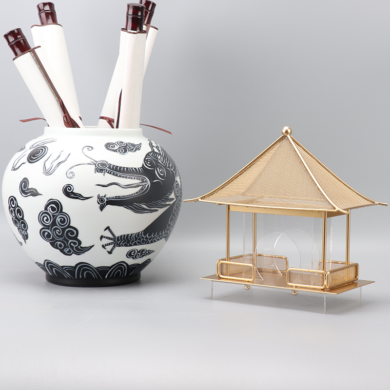 现代新中式金属亚克力建筑凉亭摆件禅意书房样板间茶室桌装饰品
