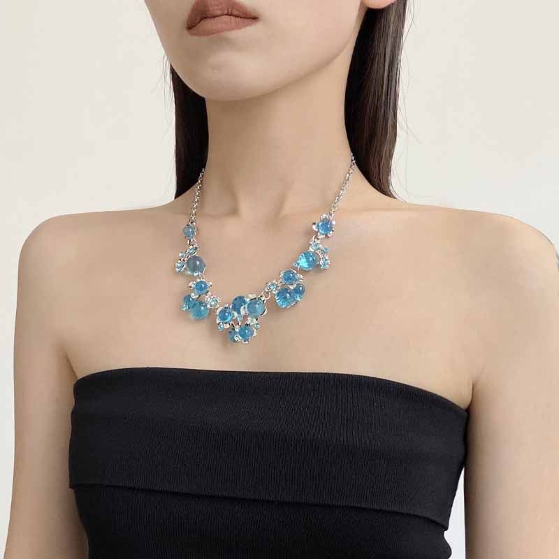 超闪蓝色水晶花朵项链女轻奢高级感重工锁骨链2025新款晚礼服颈链