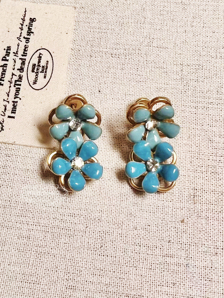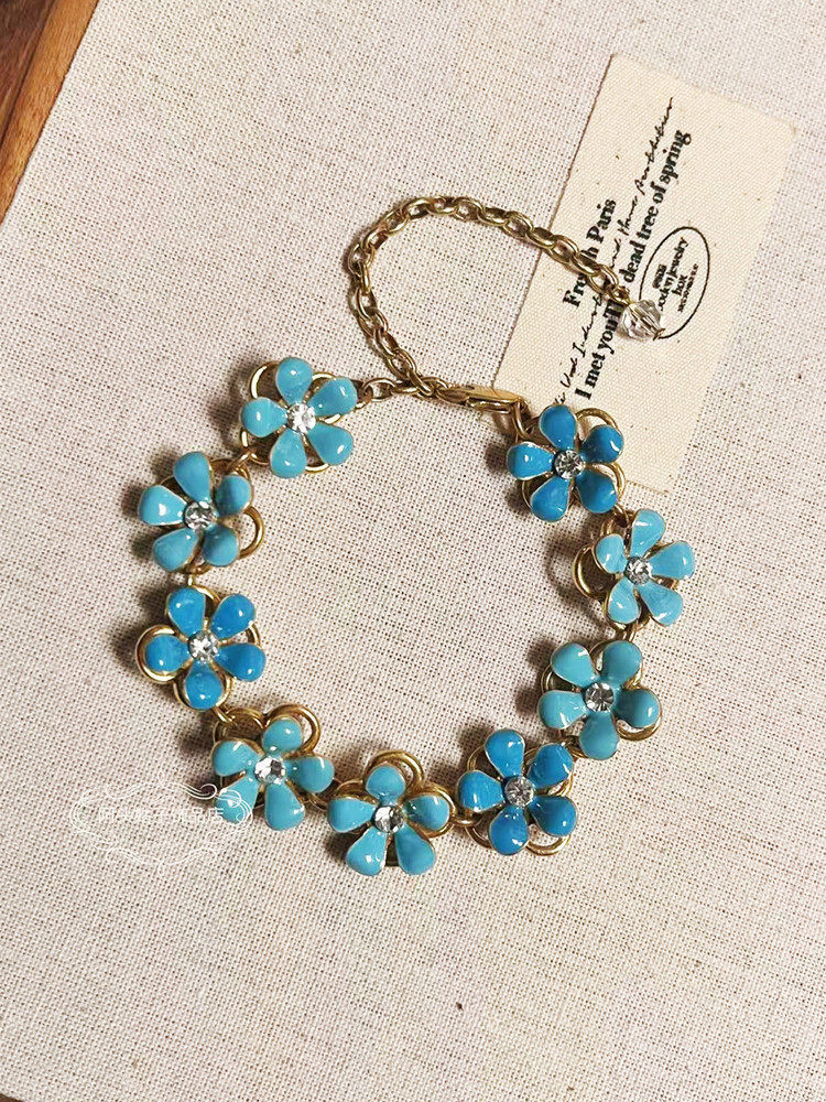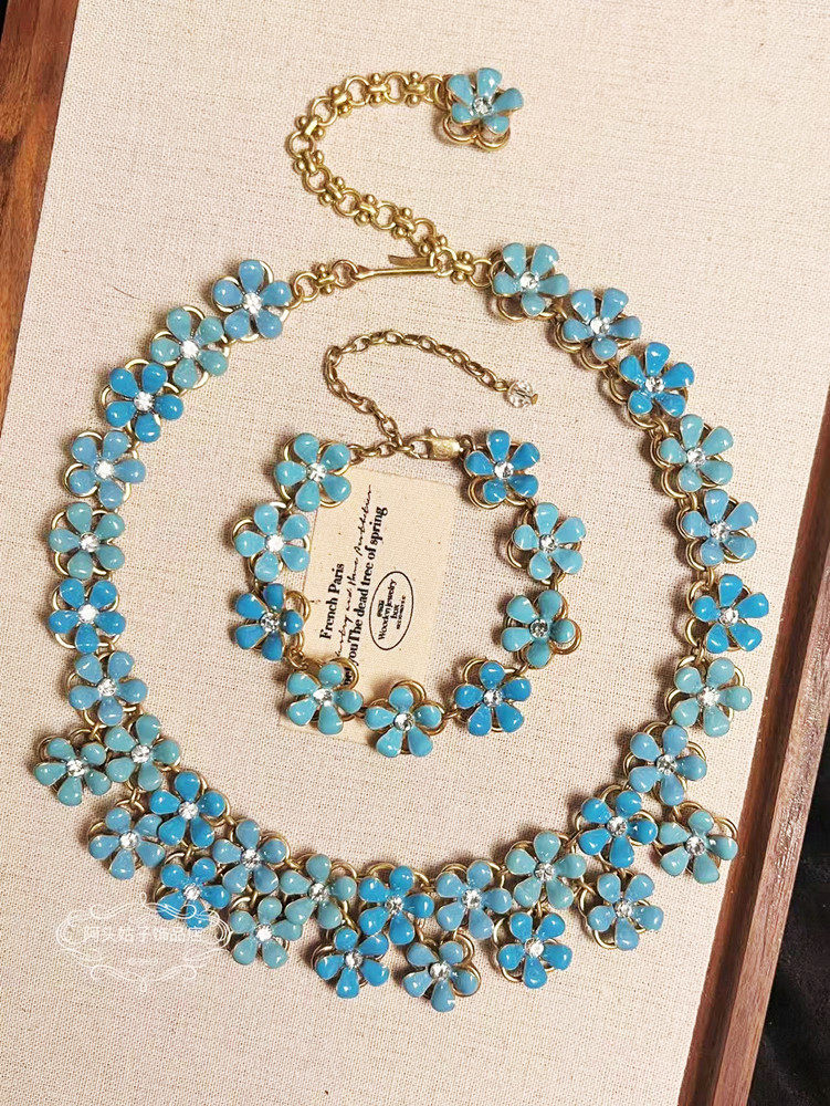 宫廷风中古vintage复古气质做旧蓝色滴油花朵项链耳环手链套装女