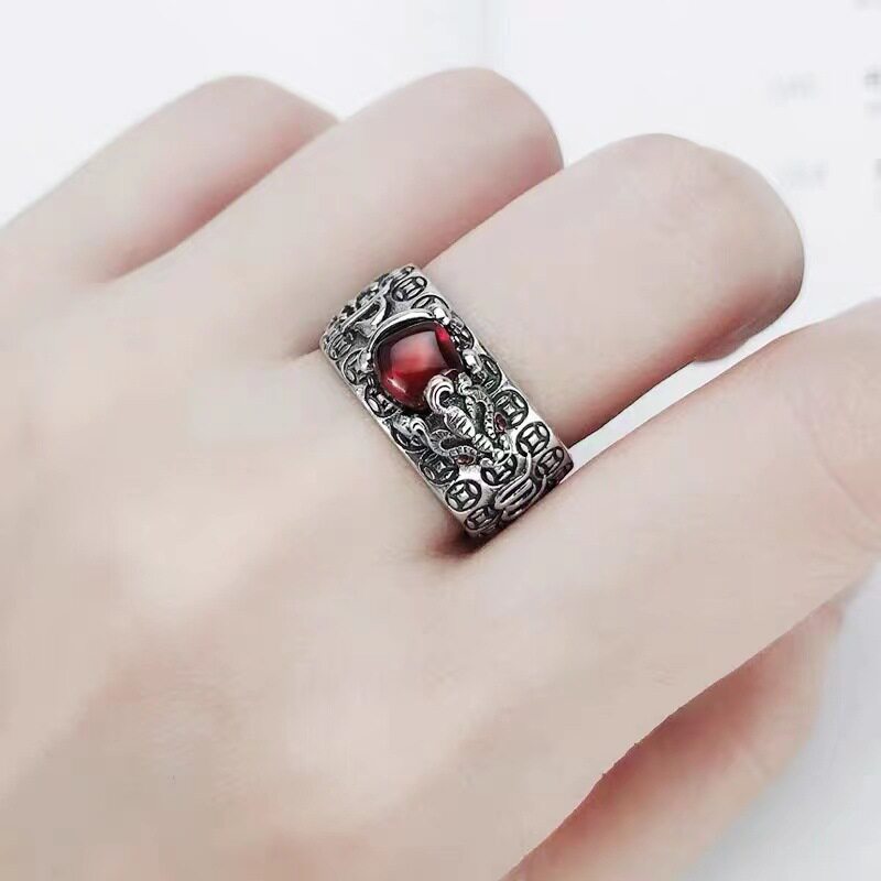 复古泰银招财转运貔貅戒指男女黄金石榴石潮六字真言开口做旧指环
