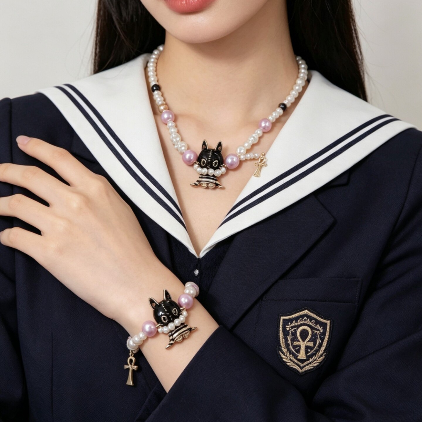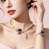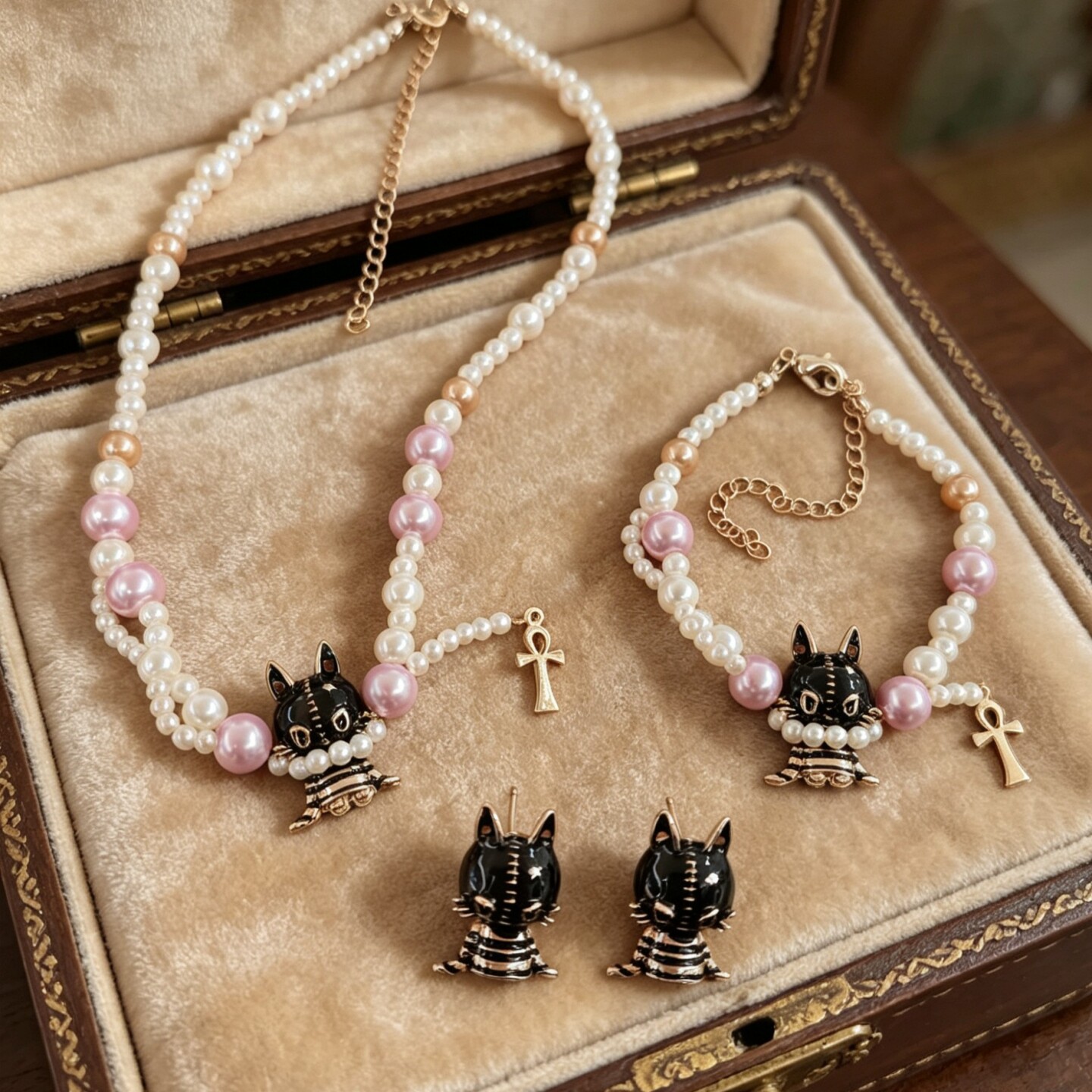 小众高级感黑色立体猫咪耳钉小猫珍珠手链甜美百搭锁骨链项链配饰