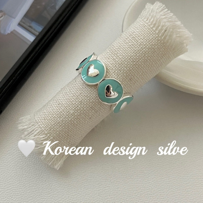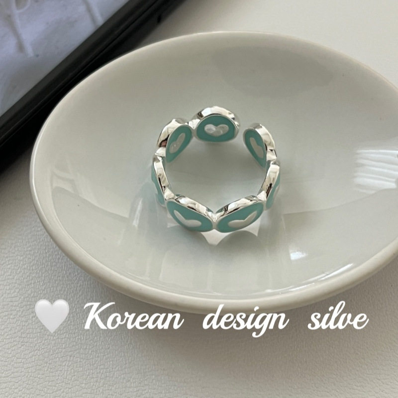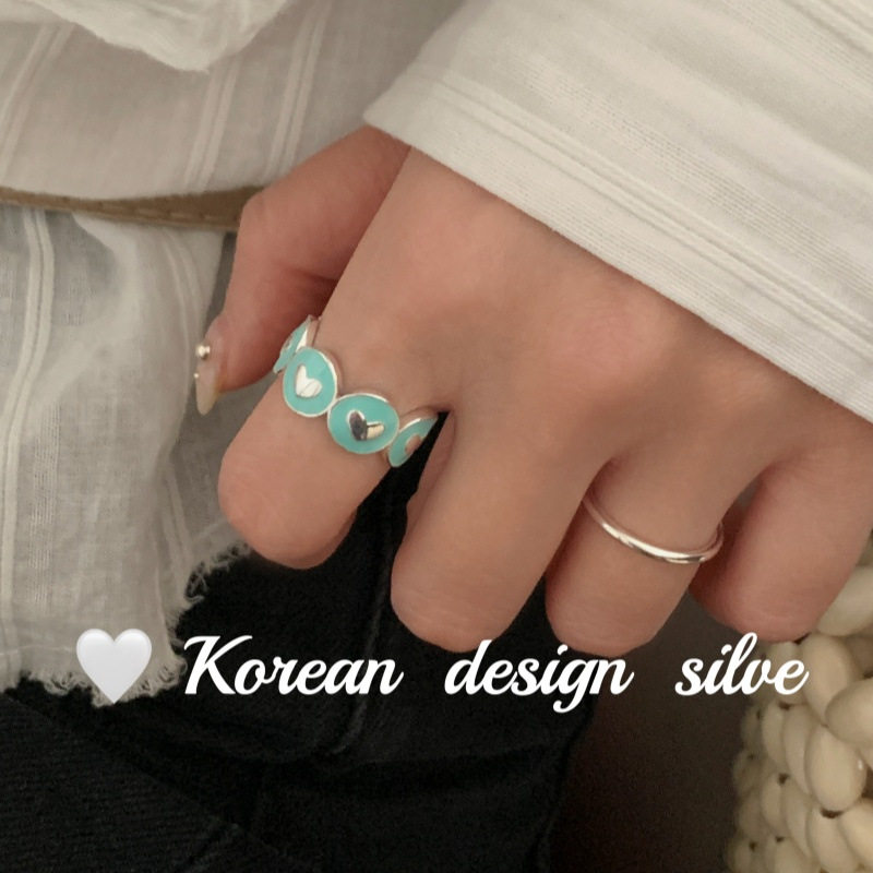 韩国亮面ins风银饰品 S925纯银爱心蓝色滴胶戒指开口可调节戒指