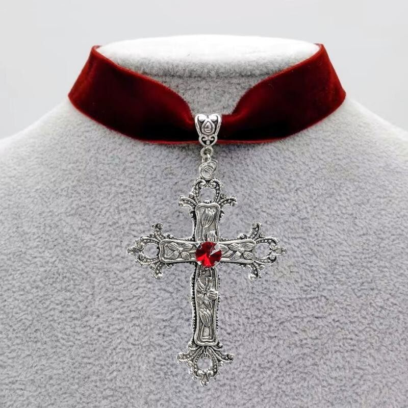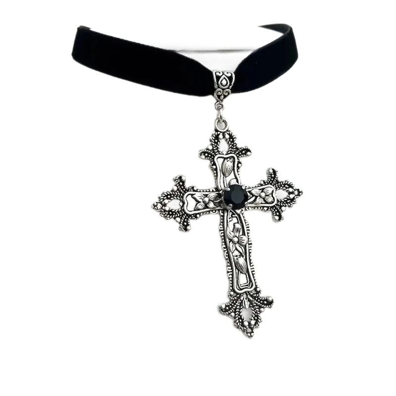 哥特风复古十字架吊坠项链黑色天鹅绒颈链男女暗黑系饰品