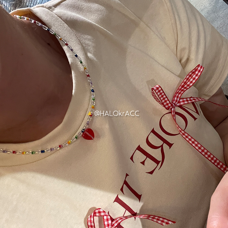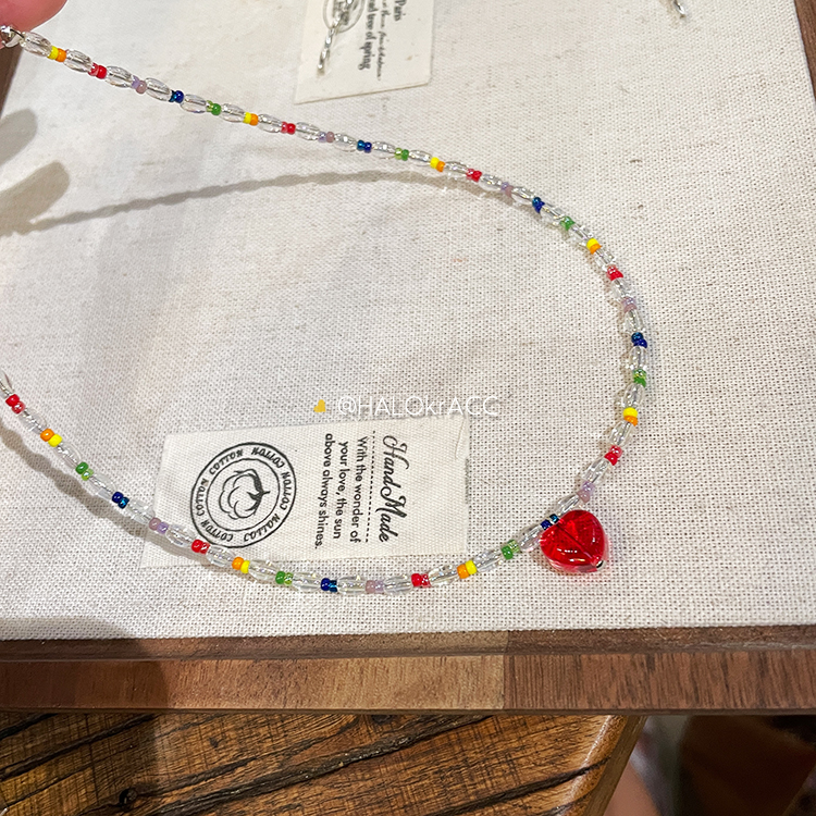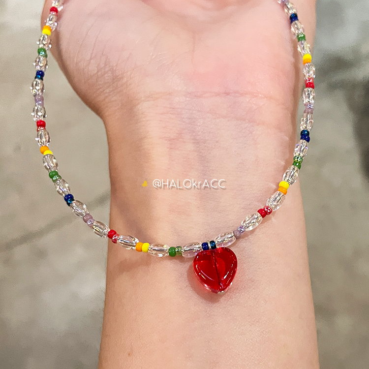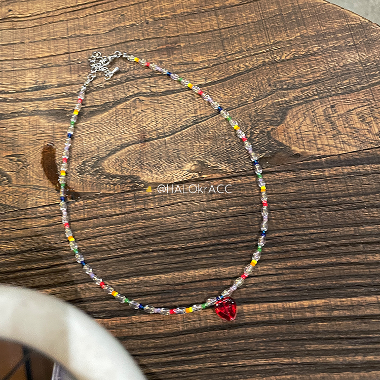 HALOkrACC韩代 雨后彩虹细巧透明彩色间隔红色透亮小爱心串珠项链